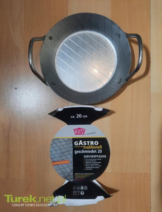 Patelnia do smażenia i serwowania z serii "Gastro traditionell" jest kuta z obu stron z żelaza o grubości 2,5 mm. Żelazna patelnia charakteryzuje się doskonałą przewodnością cieplną i rozprowadzaniem ciepła. Dzięki temu można bardzo dobrze dozować ciepło i dzięki temu osiągnąć doskonałe rezultaty smażenia. Idealnie nadaje się również na kemping, ponieważ na patelni można również smażyć na ognisku lub na grillu. Dzięki tradycyjnej patelni żelaznej steki na zewnątrz stają się chrupiące i soczyste w środku; smażone ziemniaki będą wyjątkowo chrupiące i smaczne. Można używać w piekarniku Do wszystkich rodzajów kuchenek, w tym indukcyjnych. Przy każdym użyciu poprawiają się właściwości smażenia patelni. Dzięki temu potrawy nie przywierają i to bez powłoki nieprzywierającej. Średnica: 20 cm. Produkt powystawowy. Faktyczny stan przedmiotu przedstawiony od 2zdjecia. Zastępcze opakowanie. 112/25