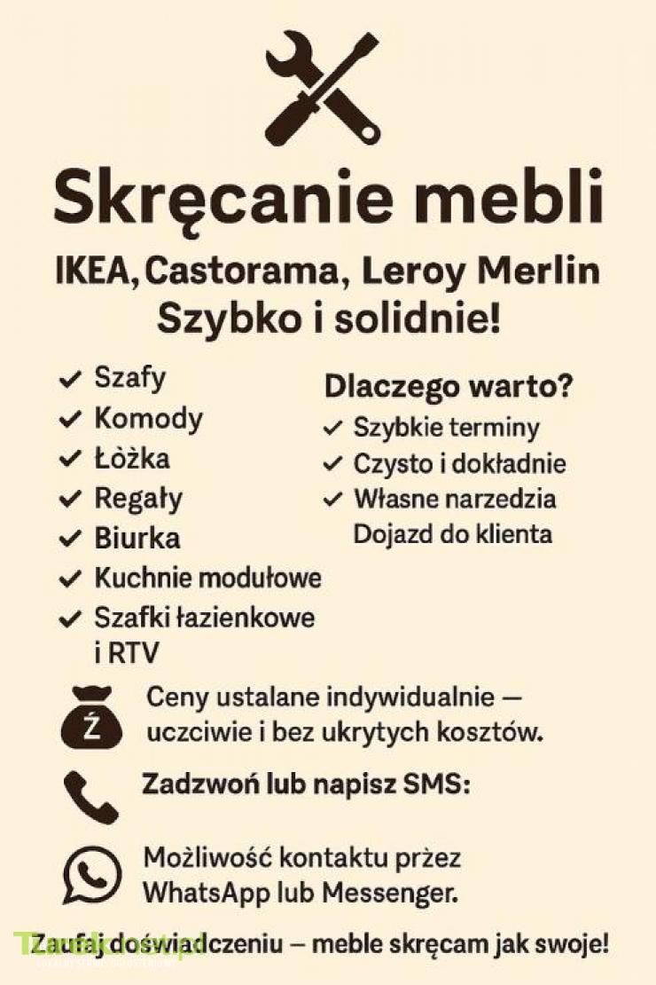 Montaż mebli Szukasz solidnego fachowca do montażu mebli? Oferuję profesjonalny montaż mebli z paczek (Castorama, Leroy Merlin, IKEA i inne). * Montaż mebli pokojowych, kuchennych, biurowych * Montaż AGD i RTV * Dojazd do klienta Działam szybko, dokładnie i z dbałością o szczegóły