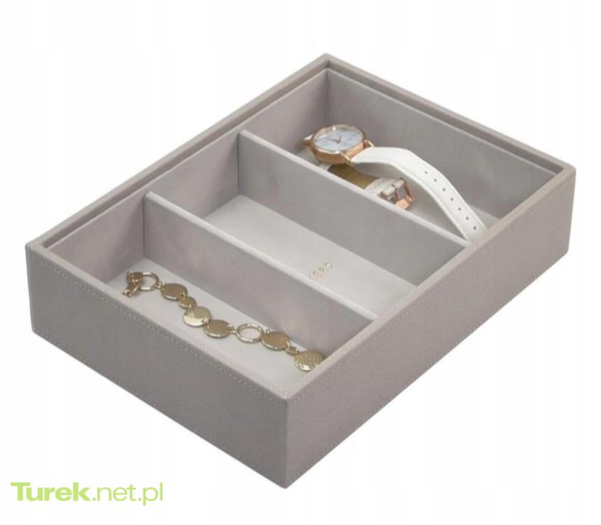 Organizer na zegarki, akcesoria Stackers Classic. Pozwala wygodnie przechowywać zegarki, okulary przeciwsłoneczne lub dużą biżuterię. Sprawdza się jako samodzielny wkład np. do organizacji szuflady. Organizer Classic Stackers w beżowym kolorze z pewnością Ci się spodoba, jeśli posiadasz zegarki, okulary przeciwsłoneczne lub duże kolczyki. Został podzielony na 3 komory, w których zmieścisz wspomniane akcesoria. Wnętrze organizera Classic Stackers jest wyłożone miękkim aksamitem, który zapobiega m.in. porysowaniu szkieł w zegarkach oraz okularach. Pojemnik z zewnątrz wykończono skórą ekologiczną. Organizer na akcesoria Classic Stackers możesz dowolnie łączyć z innymi wkładami oraz kasetkami na biżuterię z tej kolekcji tworząc spersonalizowaną całość. Wymiary: 25x18x6. Produkt powystawowy. Faktyczny stan przedmiotu przedstawiony od 2zdjecia. Produkt posiada delikatna skaze- widoczna na ostatnich zdjęciach.