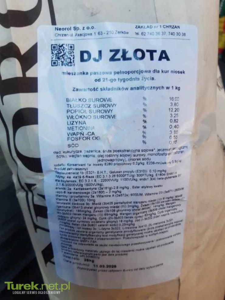 DJ ZŁOTA - mieszankę paszową pełnoporcjową dla kur niosek. W/w pasza zwiększa nieśność kur, poprawia jakość i ilość składanych jaj oraz dostarcza kluczowych składników odżywczych wspierających zdrowy rozwój kur.