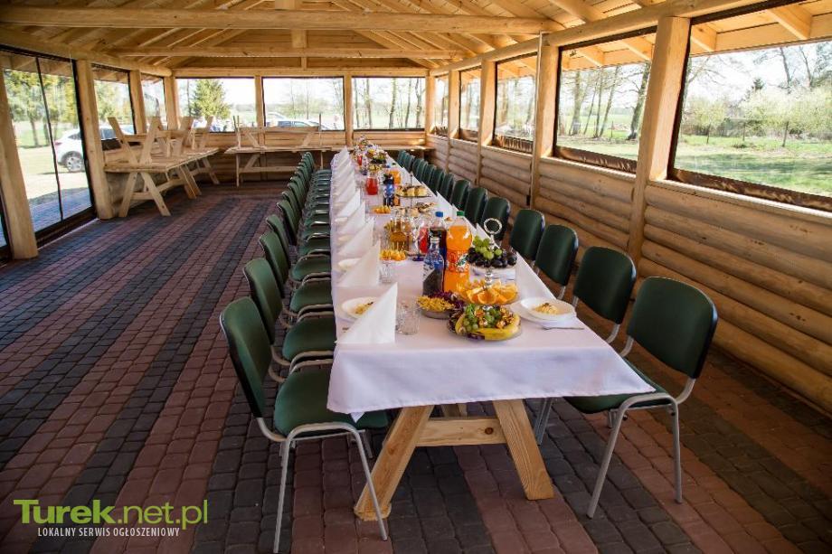 Do budynku przylega altana biesiadna zbudowana z bali z zabudową o wymiarach 20m x 6m