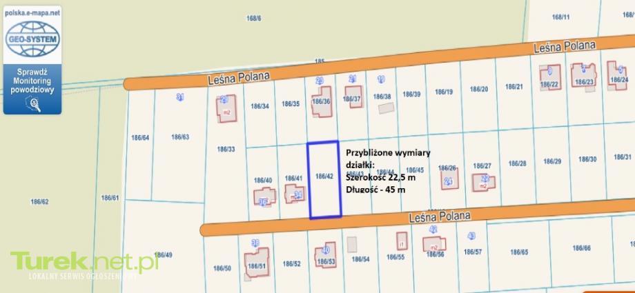 Działka ma powierzchnię 1024 m2 o przybliżonych wymiarach 23x45 m.