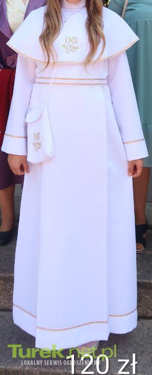 Sprzedam albę komunijną( komunia w kościele NSPJ w Turku) w zestawie z torebką, długość alby to 132 cm. cena 120 zł.