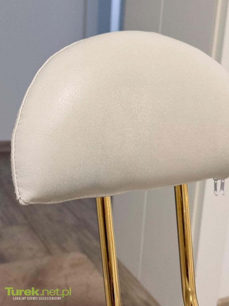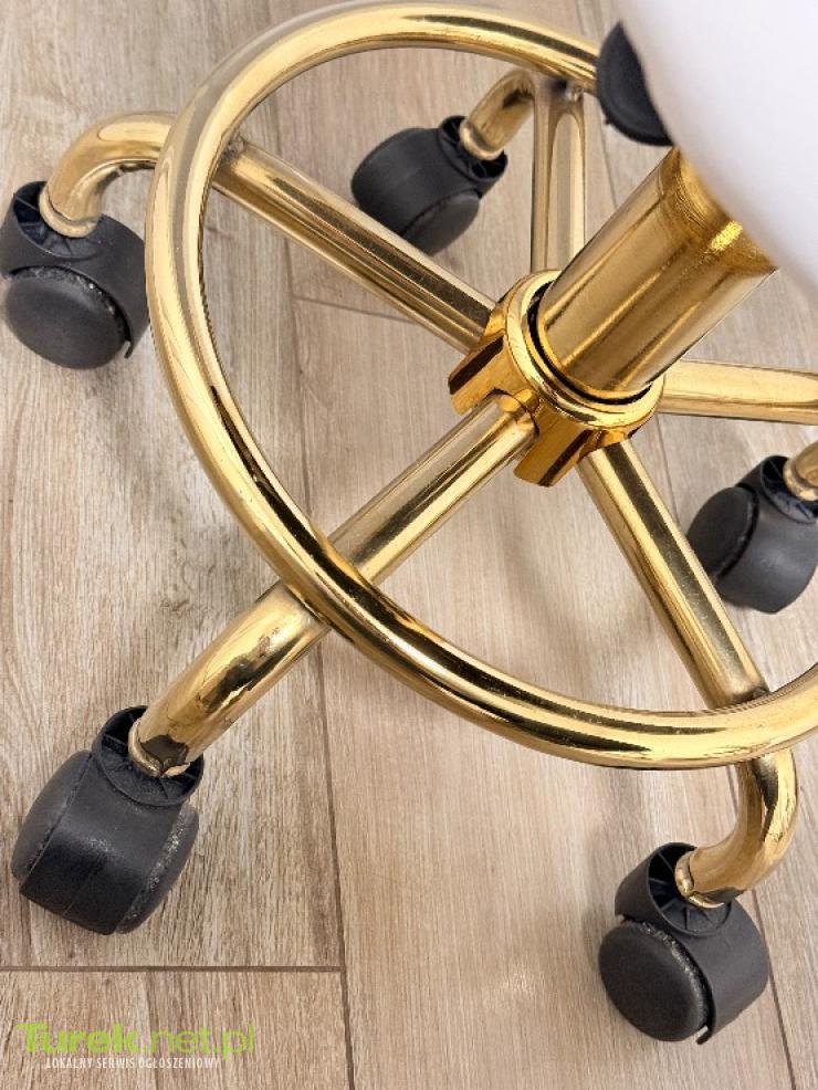 Elegancki i wygodny fotel kosmetyczny idealny do salonu urody, gabinetu stylizacji rzęs, manicure, makijażu czy tatuażu. Nowoczesny design łączy białą, ekoskórzaną tapicerkę z efektownym, złotym stelażem – całość prezentuje się wyjątkowo stylowo i profesjonalnie. Opis: • Kolor: biały ze złotym wykończeniem • Materiał: ekoskóra (łatwa w czyszczeniu i odporna na zabrudzenia) • Stabilna, metalowa podstawa na pięciu kółkach • Regulacja wysokości siedziska • Wygodne, profilowane siedzisko typu siodło • Komfortowe oparcie wspierające kręgosłup • Obracany o 360° Stan: bardzo dobry (jednak widoczne na zdjęciach ślady użytkowania myślę że do doczyszczenia) Odbiór osobisty okolice Turku możliwość dostarczenia również Turek i okolice