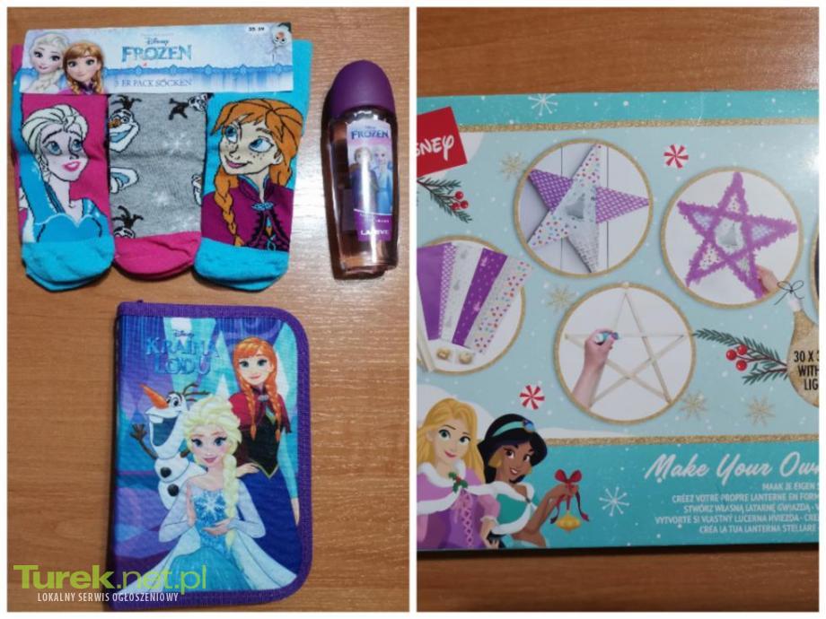 Witam sprzedam nowe rzeczy idealne na zbliżające się Mikołajki są to 3 pary skarpetek piórnik z wyposażeniem perfumy wszystko z Elsą z krainy lodu dorzucę jeszcze gwiazdę do samodzielnego złożenia która świeci.