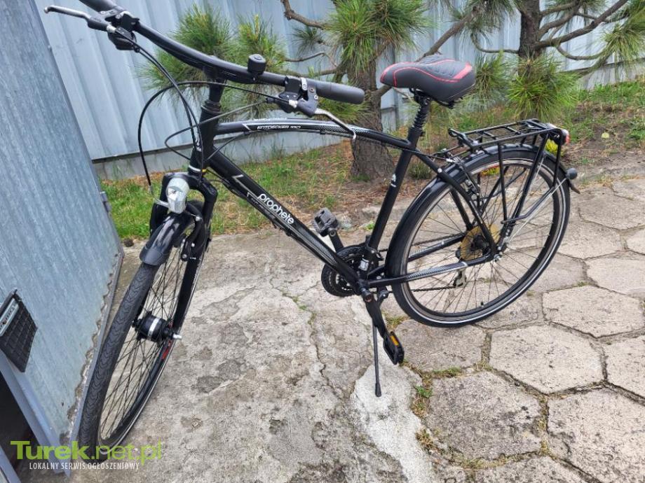 Sprzedam rower niemiecki Prophete kola 28, rama aluminiowa, osprzęt Shimano biegi 3/8, amortyzowany przód oraz siedzenie, oświetlenie sprawne, stożkowe wzmocnione koła, opony stan bardzo dobry.