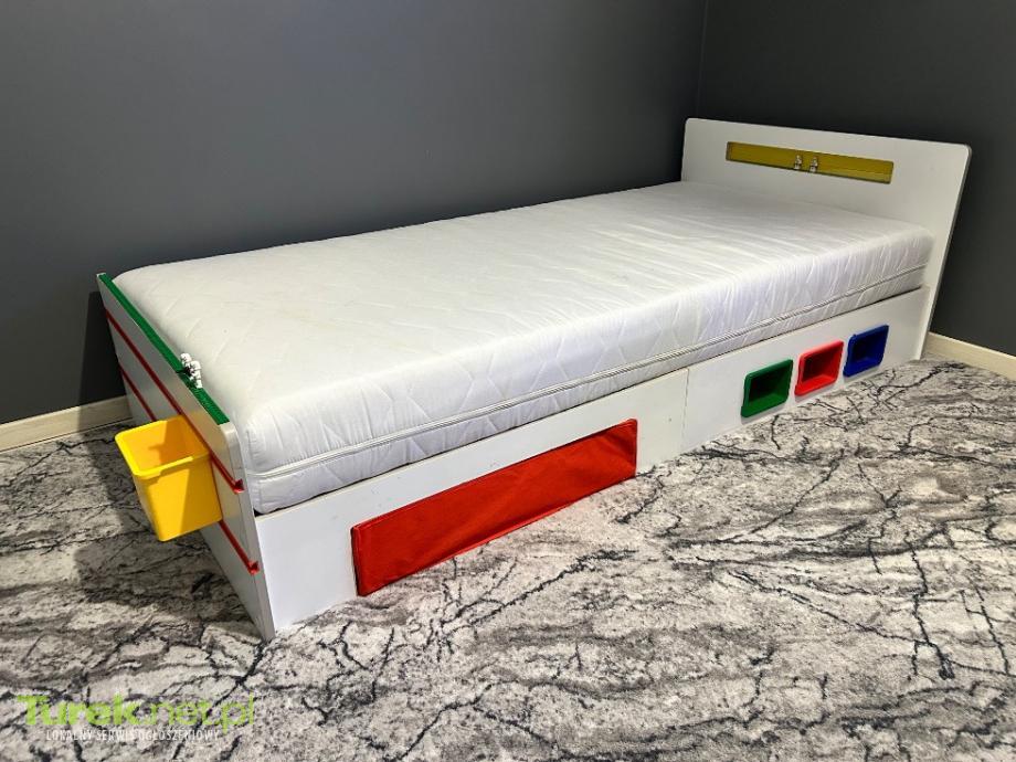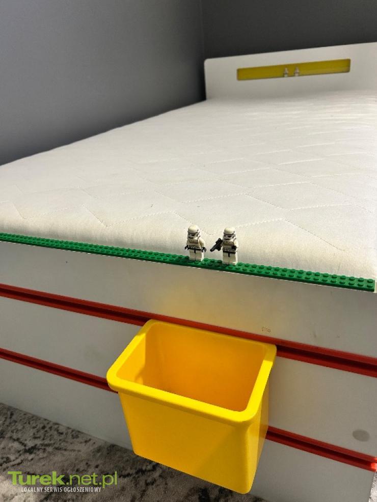Wygodne i praktyczne łóżko w stylu lego dla dziecka lub nastolatka. Wymiar materaca 190x90cm. Posiada kolorowe elementy, które mogą służyć do przechowywania drobnych przedmiotów, klocków Lego. Wymiary łóżka to 200/100 cm, co czyni je odpowiednim dla młodszych użytkowników. Łóżko jest w bardzo dobrym stanie. Odbiór osobisty Turek.