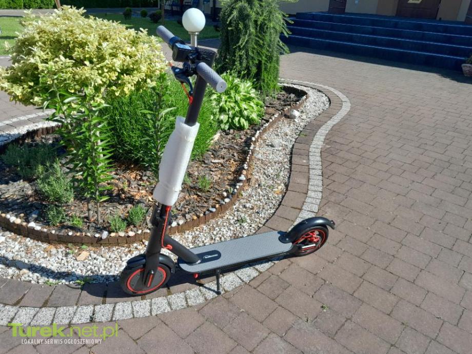 Sprzedam hulajnogę elektryczną 350W, bateria 36V 10,4 Ah. Hulajnoga posiada 3 tryby prędkości E=10km/h, D=20km/h, S=30km/h. Posiada światło stopu oraz światło przednie, dzwonek, nóżkę do podparcia, hulajnoga w bardzo łatwy sposób się składa co jest przydatne i praktyczne. Hulajnoga jest na pompowanych kołach posiada tarczowy hamulec. W zestawie również komplet kluczy w zamykanym futerale, instrukcja obsługi, zasilacz do ładowania oraz oryginalne pudełko. Hulajnoga nowa przebieg 0 km. Posiada również dedykowaną aplikację na telefon dzięki której można zmieniać ustawienia oraz sterować. Zapraszam do zakupu