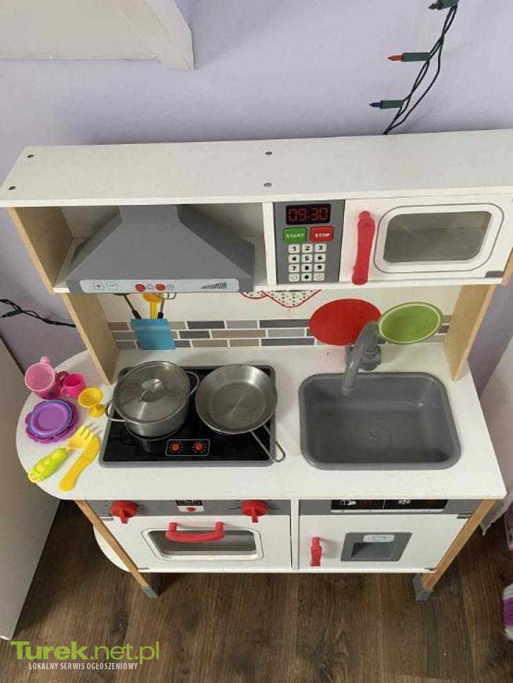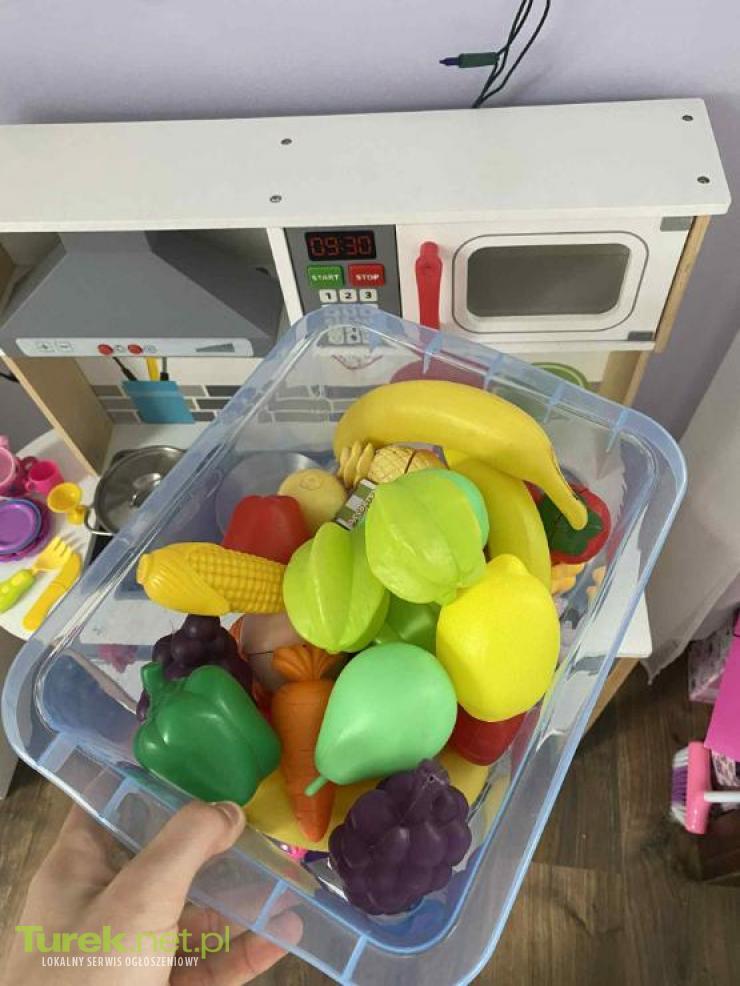 Sprzedam używaną drewnianą kuchnie lidla w bardzo dobrym stanie. kuchnia posiada m.in:wbudowaną mikrofalówkę, okap kuchenny ze światełkiem, lodówkę z kostkarką, piekarnik z oświetleniem, garnki. dorzucam widoczne na zdjęciu owice i warzywa.