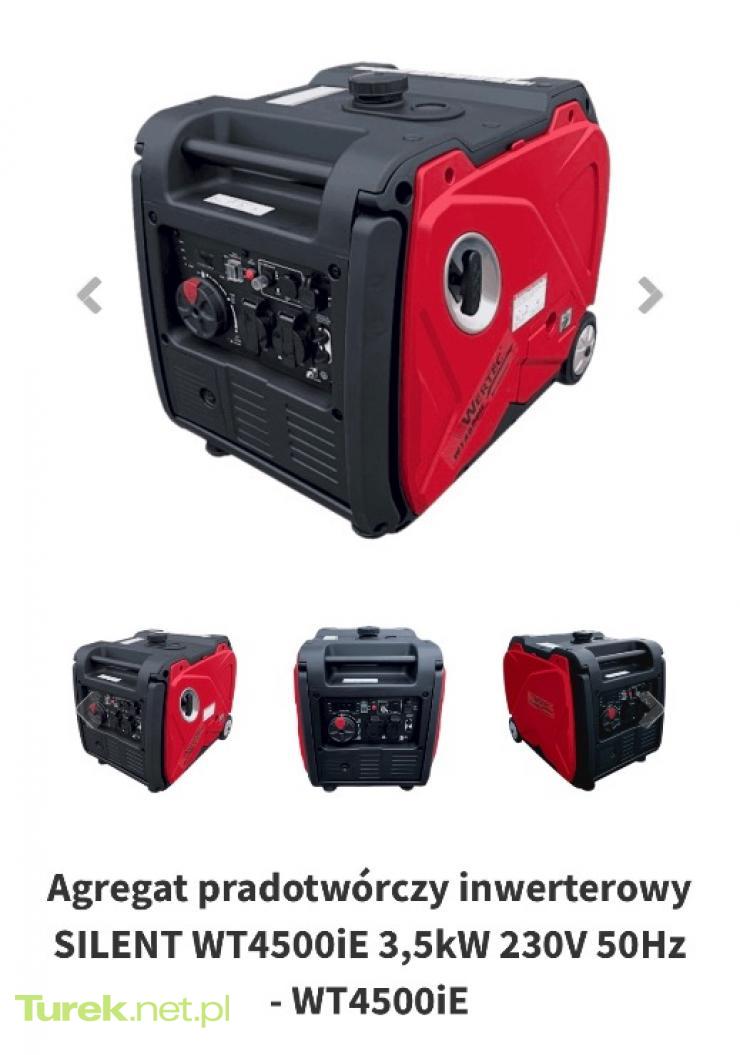 Agregat prądotwórczy inwerterowy SILENT WT4500iE 3,5kW 230V 50Hz WERTEC Opis: Agregat prądotwórczy inwerterowy SILENT WT4500iE 3,5 kW marki WERTEC to wyjątkowo cichy, wysokowydajny generator, który zapewnia niezawodne zasilanie w różnych warunkach. Dzięki nowoczesnej technologii inwerterowej, agregat jest w stanie dostarczyć stabilne i czyste źródło energii, które idealnie współpracuje z urządzeniami wymagającymi precyzyjnego zasilania, takimi jak lodówki, pralki, telewizory, komputery oraz oświetlenie. Wyróżnia go cicha praca oraz niezawodność, co czyni go idealnym rozwiązaniem do zastosowań domowych, w ogrodach, na działkach czy małych warsztatach. Cechy produktu: Moc znamionowa: 3,5 kW – wystarczająca do zasilania standardowych urządzeń gospodarstwa domowego. Maksymalna moc: 4,0 kW – pozwala na obsługę urządzeń o wyższych wymaganiach mocy. Napięcie znamionowe: 230V – zgodne ze standardem zasilania w gospodarstwach domowych. Częstotliwość: 50 Hz – zapewnia zgodność z normami sieci energetycznych. Współczynnik mocy: 1.0 – gwarantuje stabilną i efektywną pracę podłączonych urządzeń. Waga netto: 44,5 kg – kompaktowa i stosunkowo lekka konstrukcja zapewnia łatwy transport. Cicha praca: Dzięki nowoczesnej technologii "Silent", agregat wyróżnia się znacznie niższym poziomem hałasu w porównaniu do tradycyjnych agregatów. Zalety: Cisza pracy: Technologia inwerterowa i specjalna konstrukcja zapewniają niski poziom hałasu, co sprawia, że agregat idealnie nadaje się do użytku w miejscach, gdzie głośność pracy urządzeń ma znaczenie. Wysoka niezawodność: Nowoczesne zabezpieczenia umożliwiają długotrwałą, bezpieczną pracę, chroniąc agregat przed przeciążeniami. Wszechstronność: Agregat sprawdza się w szerokim zakresie zastosowań – od codziennego użytku domowego po zasilanie sprzętu w terenie. Efektywność: Inwerterowa technologia zapewnia stabilne i czyste zasilanie, co jest szczególnie ważne przy zasilaniu wrażliwych urządzeń elektronicznych. Zastosowanie: Gospodarstwa domowe: Doskonały do zasilania urządzeń takich jak lodówki, pralki, komputery, telewizory, oświetlenie. Małe warsztaty i działki: Sprawdzi się w miejscach, gdzie dostęp do sieci energetycznej jest ograniczony. Outdoor i rekreacja: Idealny na kemping, w wypoczynkowych domkach czy w miejscach, gdzie potrzebne jest niezawodne źródło energii. Agregat prądotwórczy inwerterowy SILENT WT4500iE 3,5 kW to nowoczesne, ciche i wydajne urządzenie, które łączy w sobie dużą moc z niskim poziomem hałasu, co czyni go doskonałym wyborem dla użytkowników wymagających niezawodnego źródła energii w różnych warunkach. Dzięki swojej konstrukcji, idealnie sprawdza się w użytku domowym i na działkach.