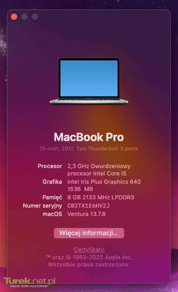Laptop Apple MacBook Pro 13' z 2017 roku w kolorze srebrnym A1708. Posiada ekran o przekątnej 13,3 cala.