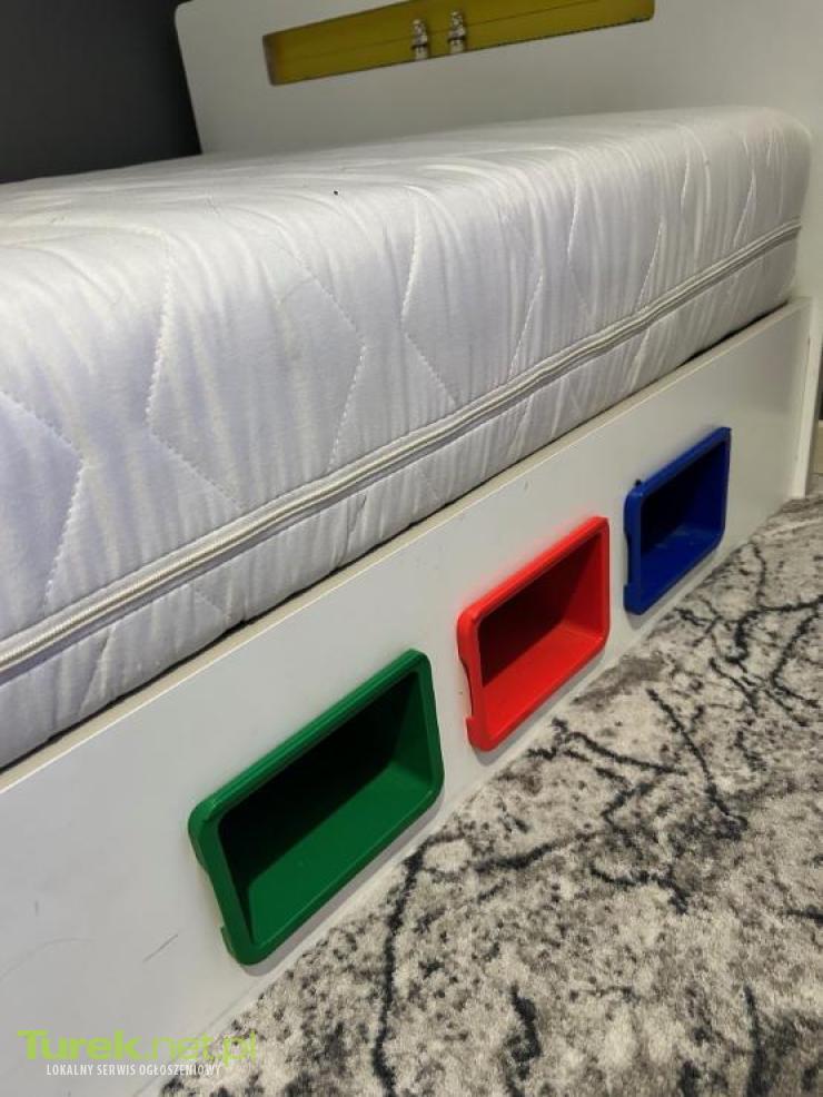 Wygodne i praktyczne łóżko w stylu lego dla dziecka lub nastolatka. Wymiar materaca 190x90cm. Posiada kolorowe elementy, które mogą służyć do przechowywania drobnych przedmiotów, klocków Lego. Wymiary łóżka to 200/100 cm, co czyni je odpowiednim dla młodszych użytkowników. Łóżko jest w bardzo dobrym stanie. Odbiór osobisty Turek.