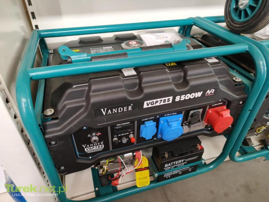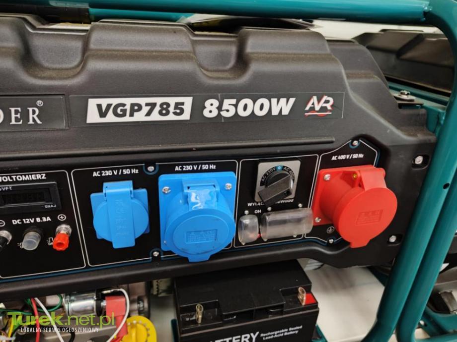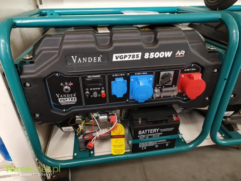 Agregat Prądotwórczy 230/400V 8500W VANDER VGP785 . Odpalany z rozrusznika i linki . Koła transportowe w zestawie . Typ: zmiennofazowy | Paliwo: benzyna | Moc maksymalna: 8500 W | Pojemność zbiornika paliwa: 25 litrów | Rozruch: ręczny i elektryczny | Silnik: 4-suwowy o mocy 18,25KM | Waga: 92 kg | Gniazda: 2x gniazdo 230V, 1x gniazdo 400V, 1x prąd stały 12V AVR. FV gwarancja , możliwość dowozu .