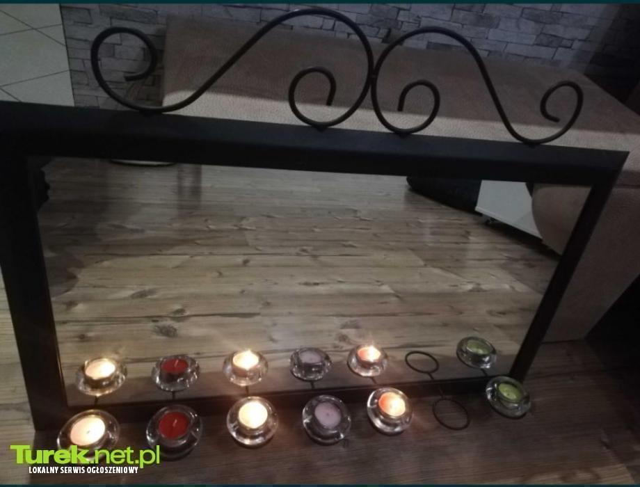 Duże ozdobne lustro w metalowej ramie oraz z miejscem na świeczniki. Wysokość 45cm, długość 78cm.