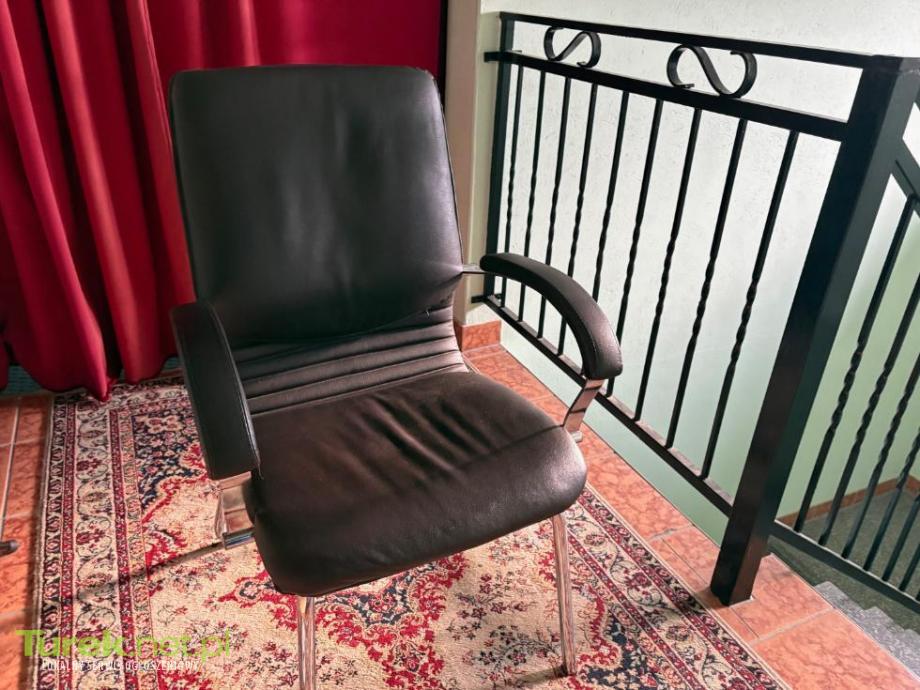 Wygodny, skórzany fotel biurowy w kolorze czekoladowym Posiada podłokietniki, zapewniając komfort podczas pracy. Fotel jest używany, ale w dobrym stanie technicznym. Może być idealnym rozwiązaniem do domowego biura lub przestrzeni roboczej.
