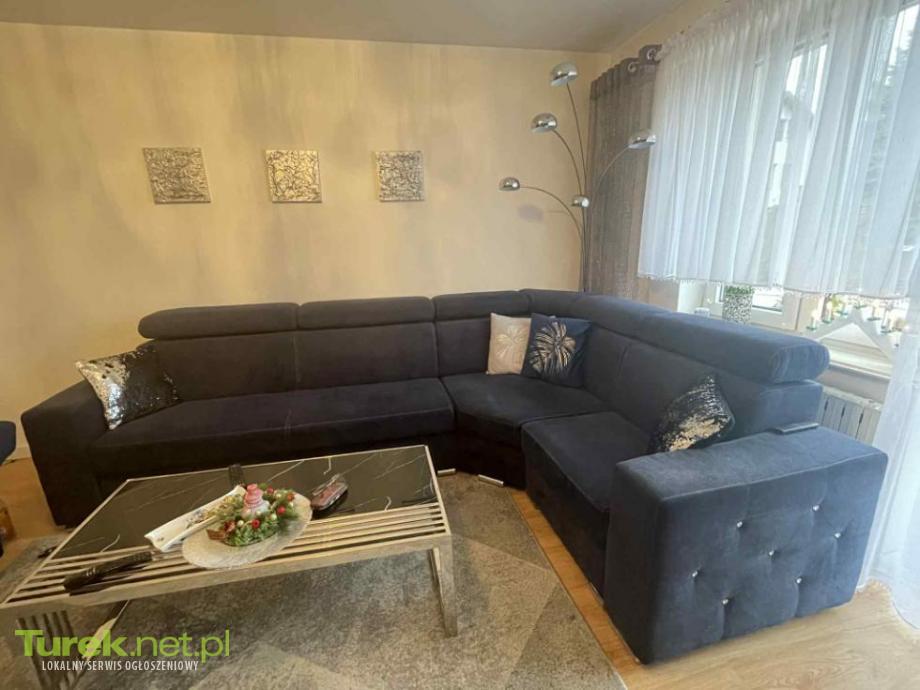 Sprzedam kanapę narożnikowa z regulowanymi zagłówkami. wymiary: 300 x 200 [cm], głębokość siedziska 50 cm kolor granatowy, na zewnętrznych stronach oparcia wysadzana ozdobnymi kryształkami. w zestawie otwierana pufa ze schowkiem. wymiary: 83x43x40 stan mebli bardzo dobry, wykonane na zamówienie 3 lata temu.