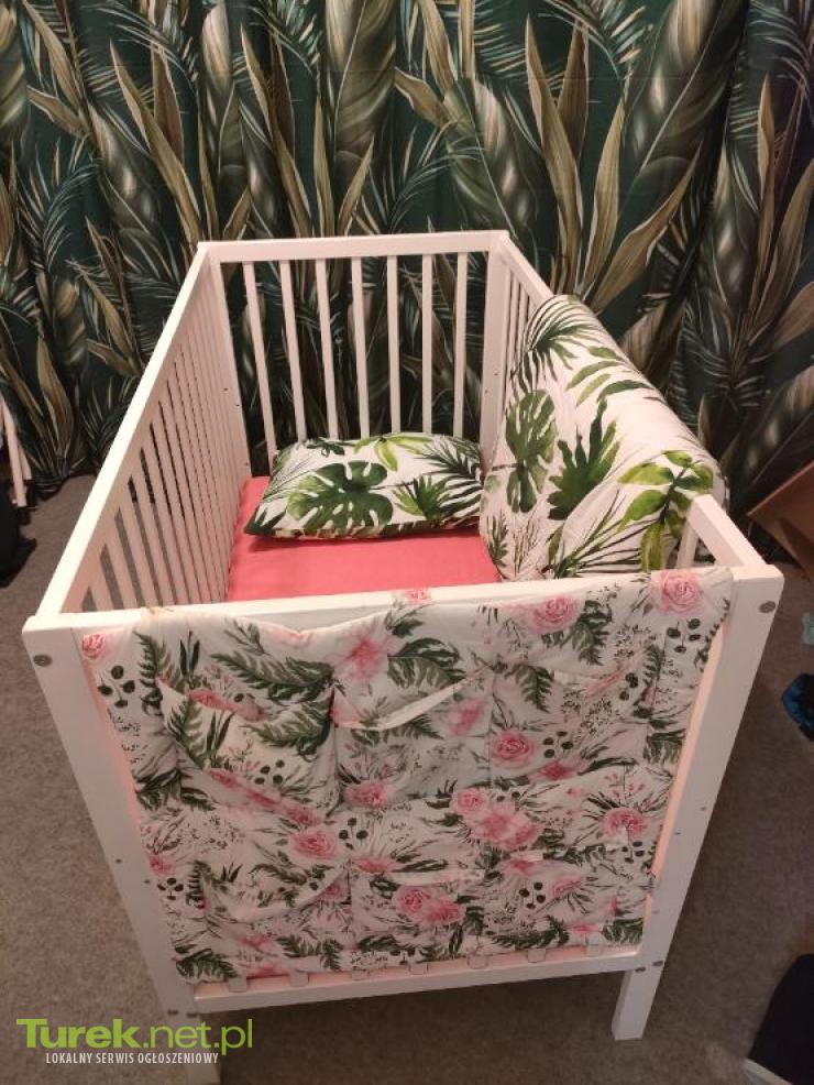 Łóżeczko dziecięce regulowane na dwie wysokości z materacem, organizerem, kołderką, poduszką, dwiema zmianami pościeli i dwoma prześcieradłami. Łóżeczko nieużywane.