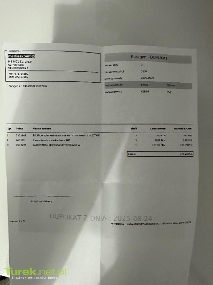 Sprzedam nowy telefon komórkowy myPhone dla seniora. Telefon nie był praktycznie używany. Telefon jest z bazą ładowania. Kolor brązowy. Telefon nie posiada żadnych śladów użytkowania. Telefon zakupiony w sierpniu 2025 roku więc ma on jeszcze gwarancję. Fakturę załączam poniżej. Cena do małej negocjacji.