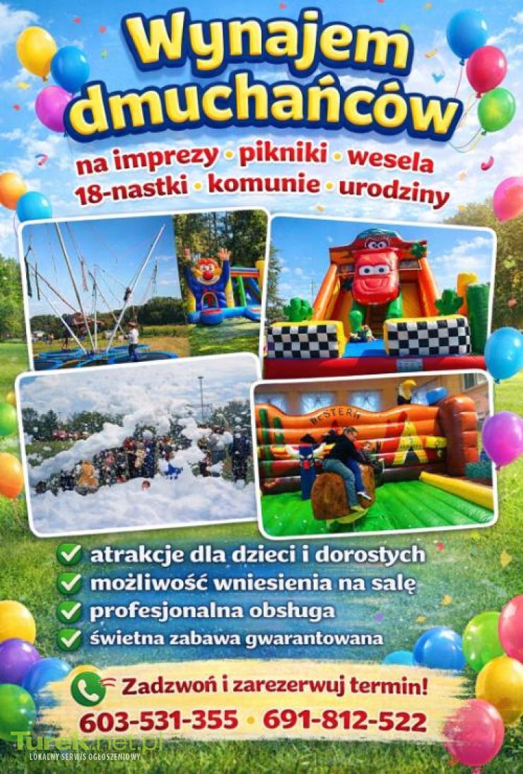 Wynajem dmuchańców ???? na imprezy • pikniki • wesela 18-nastki • komunie • urodziny ✔ atrakcje dla dzieci i dorosłych ✔ możliwość wniesienia na salę ✔ profesjonalna obsługa ✔ świetna zabawa gwarantowana ???? Zadzwoń i zarezerwuj termin!