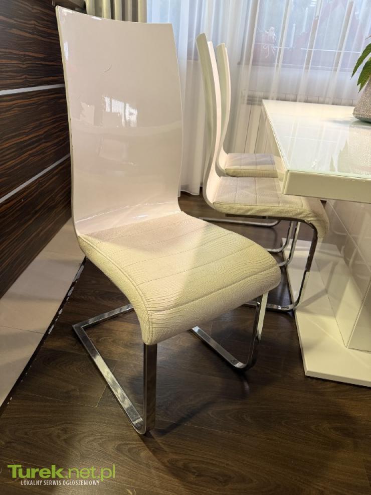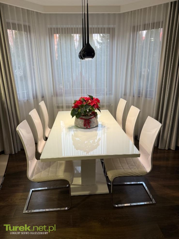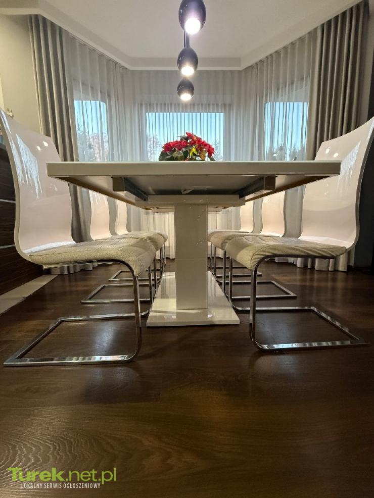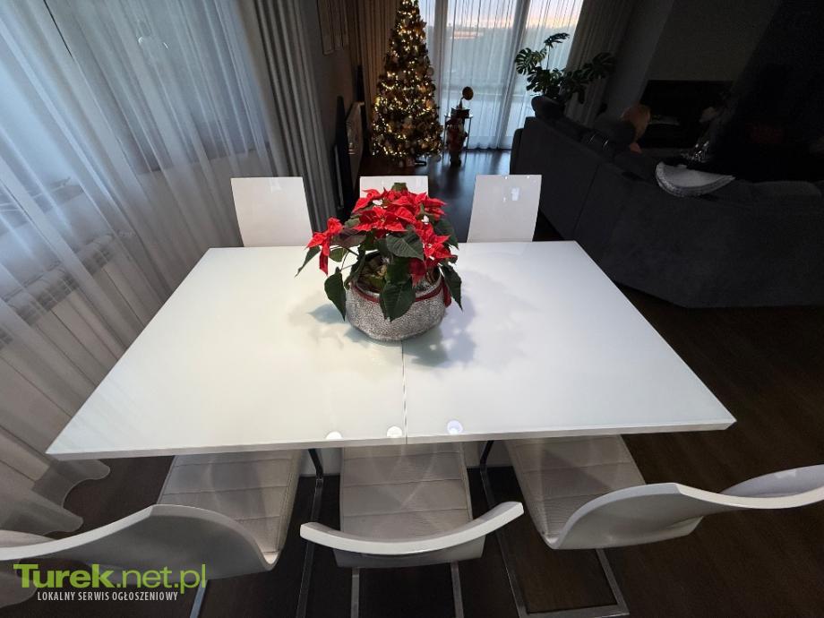 Sprzedam stół z 6 krzesłami. Stół wykonany jest z płyty meblowej, która na wierzchu pokryta jest szkłem hartowanym. Stół złożony ma wymiar 180cm x 100cm. Dodatkowo jest wkładka 50cm wydłużająca stół do 230cm. Siedziska krzeseł pokryte są ekoskórą. Tylko odbiór osobisty. Polecam!