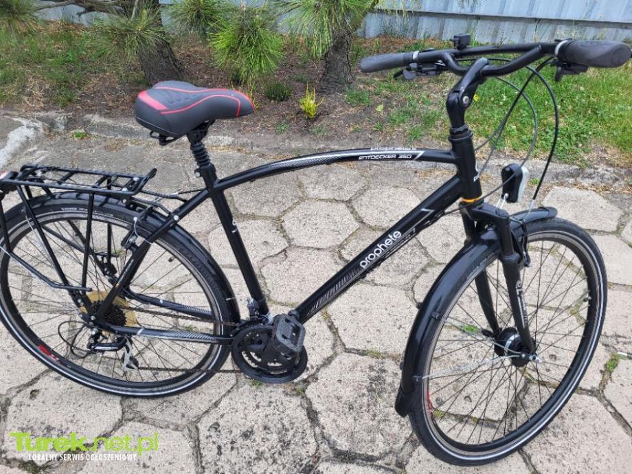Sprzedam rower niemiecki Prophete Entdecker 350 , rama aluminiowa, osprzęt Shimano biegi 3/8, amortyzowany przód oraz siedzenie, oświetlenie sprawne, stożkowe wzmocnione koła, opony stan bardzo dobry.
