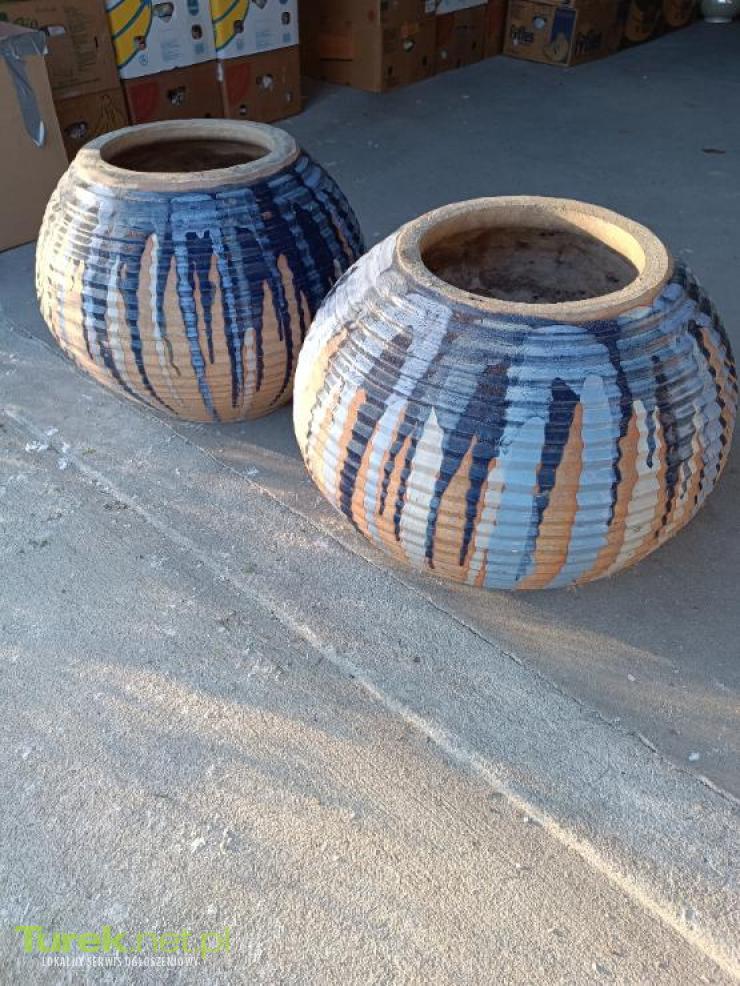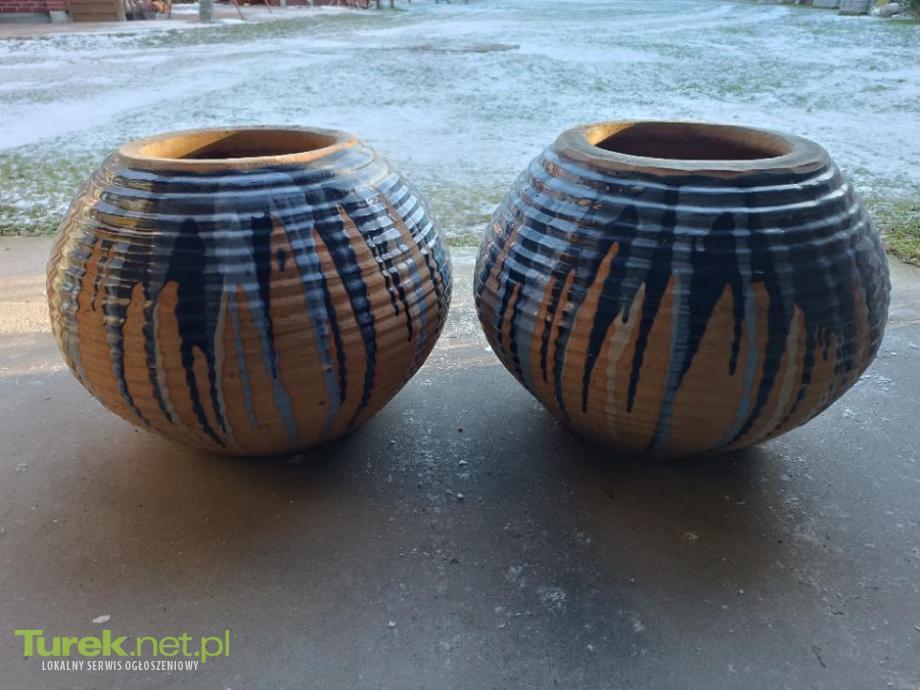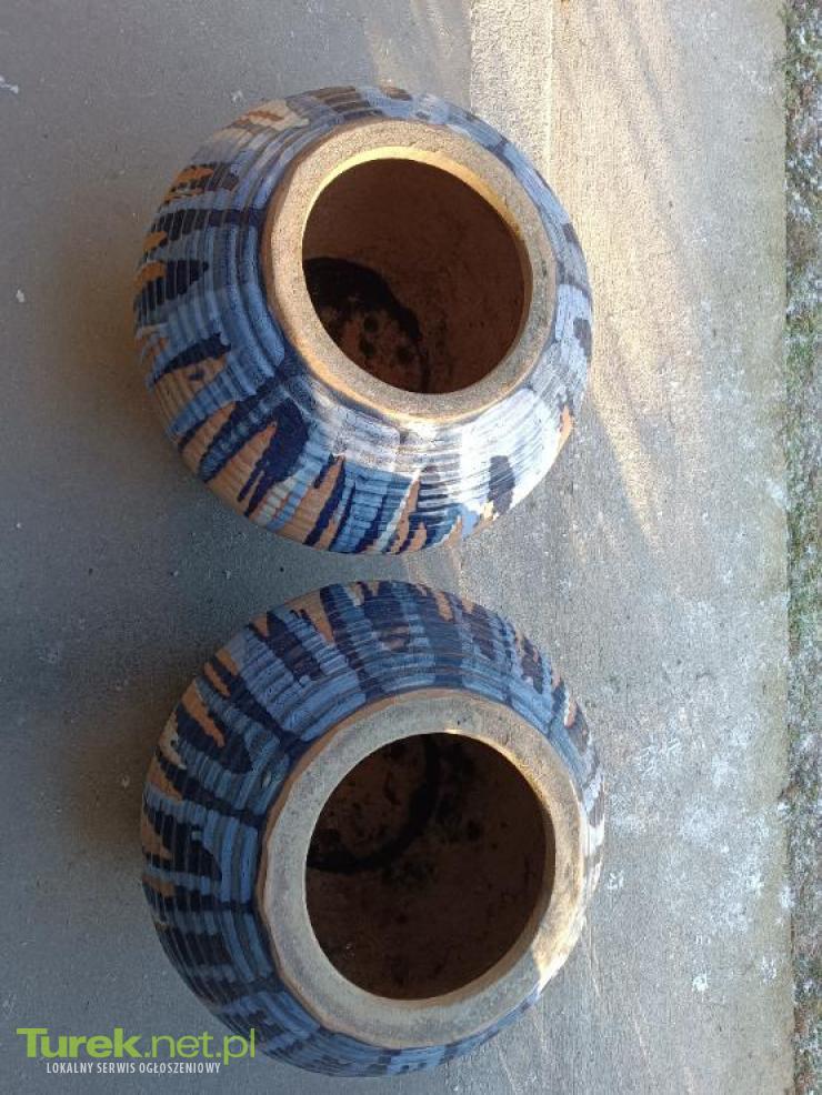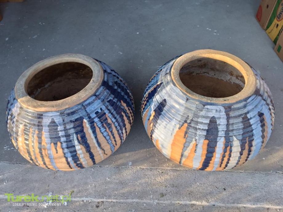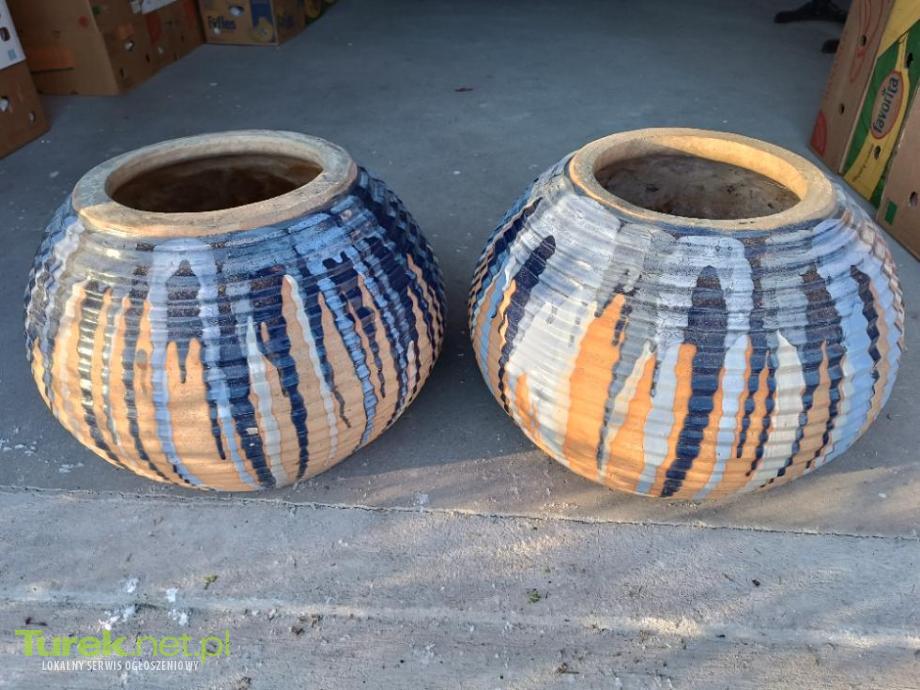 Dwie kolorowe donice ogrodowe w stylu etnicznym. Wykonane z gliny, z ciekawym, falistym wzorem w odcieniach niebieskiego i beżowego. Donice mają nieregularny kształt, co nadaje im unikalny charakter. Mogą służyć jako dekoracja ogrodu lub tarasu.