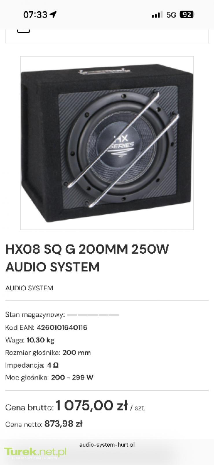 Na sprzedaż świetny subwoofer cenionej marki Audio System z najwyższej serii HX (model HX 08 SQ). Głośnik o rozmiarze 8 cali (20 cm), który słynie z niesamowitej precyzji i jakości dźwięku (SQ). Moc: 250W RMS / 350W Max Skrzynia: Wykonana z grubego MDF, zapewnia solidne uderzenie bez rezonansów. Głośnik jest w 100% sprawny. Nie charczy, nie śmierdzi, membrana i zawieszenie w idealnym stanie. Pracował pod markowym wzmacniaczem z dobrze ustawionymi filtrami. Idealne rozwiązanie dla kogoś, kto szuka jakościowego basu, nie tracąc przy tym miejsca w bagażniku. Możliwa wysyłka lub odbiór osobisty (Brudzew/okolice). Zapraszam do kontaktu!