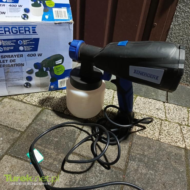Elektryczna pistolet natryskowy Energer do malowania powierzchni. Urządzenie pozwala na szybkie i równomierne nakładanie farby Posiada zbiornik na płyn oraz regulację strumienia. Praktyczne narzędzie do prac remontowych i dekoracyjnych w domu.