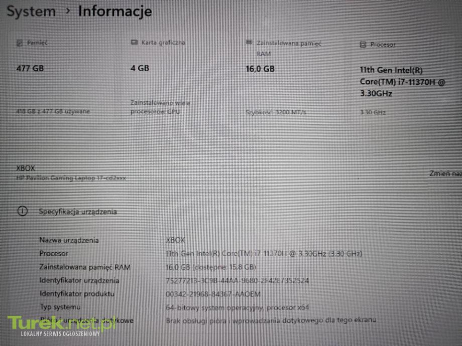 Sprzedam laptop hp pavilion gaming jestem pierwszym wlascicielem . Laptop jest w stanie bardzo dobry plus, w pelni sprawny . Parametry 16gb ram 17 cali 512gb pamieci ogolnej Intel corr i7 Karta graficzna nvidia geforce rtx Windos 11 Zestaw obejmuje laptop wraz z orginalna ladowarka . Torbe na laptop dorzucam gratis . Preferuje odbiór osobisty .