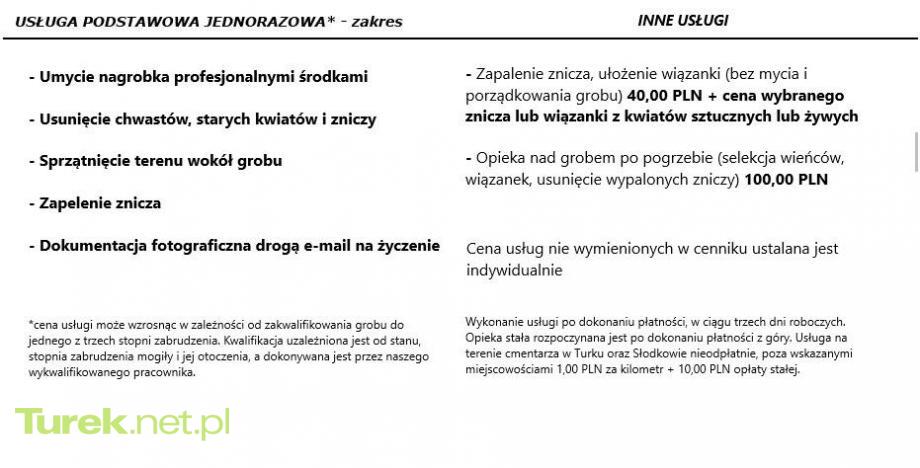 Wszyscy pragniemy pamiętać o Tych, którzy odeszli z naszego życia, a dowodem pamięci o Nich jest troska i dbałość o miejsce Ich spoczynku. Nie zawsze jest to jednak możliwe, dlatego polecamy Państwu Nasze usługi w tym zakresie.Zajmujemy się opieką oraz sprzątaniem grobów. Z Nami nie muszą się Państwo martwić o wygląd miejsc spoczynku Waszych bliskich. Oferujemy najwyższy poziom usług, gdyż w swej pracy kierujemy się zasadą dokładności i staranności oraz poszanowaniem miejsc pochówku zmarłych. Posługujemy się tylko sprawdzonymi środkami do pielęgnacji i konserwacji nagrobków. Zapraszamy do zapoznania się z ofertą