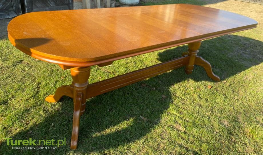 Solidny, drewniany, duży, rozkładany stół z 12 krzesłami. Idealny do jadalni lub kuchni. Stół ma ładny, ciepły kolor i jest w dobrym stanie. Cena za zestaw 500 zł.