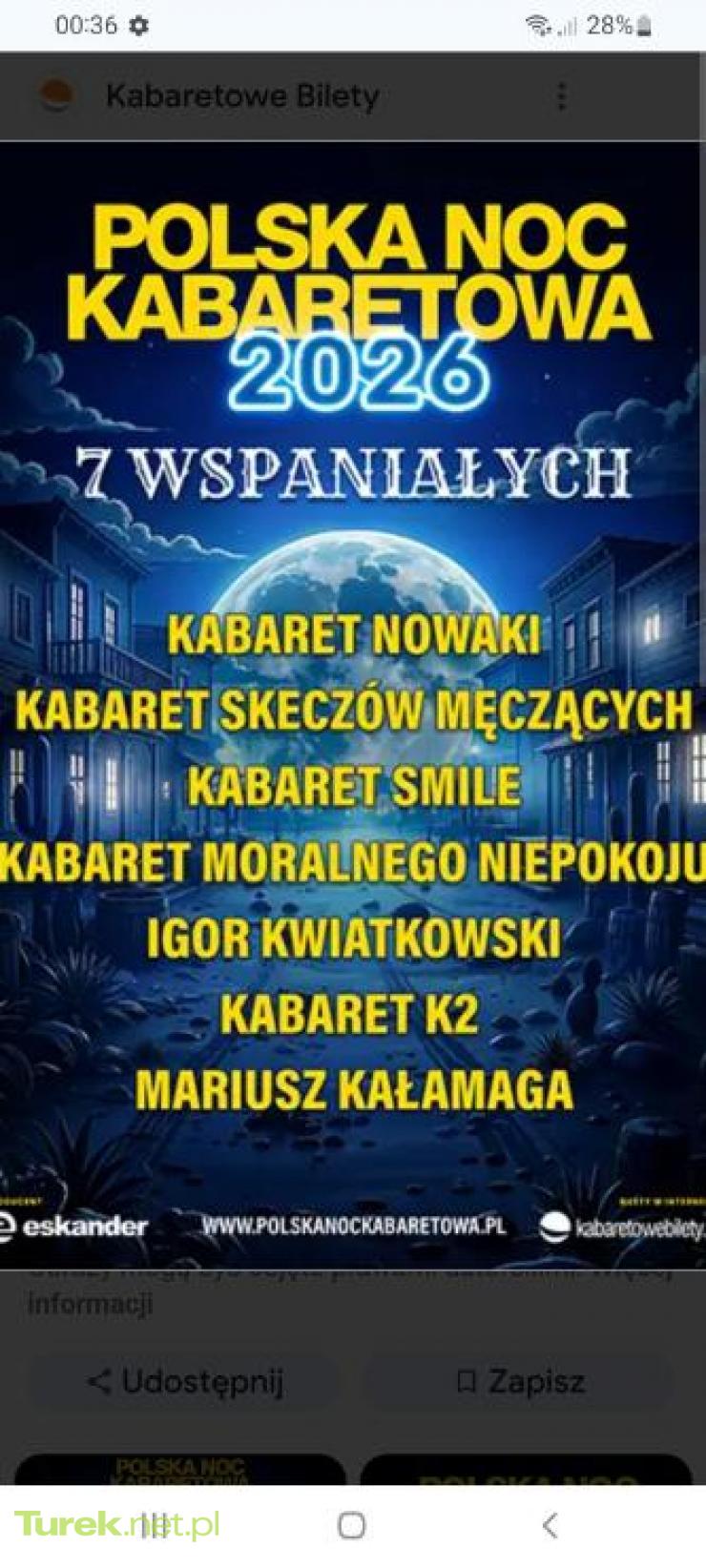 Sprzedam dwa bilety na Polską Noc Kabaretową 2026 do Łodzi na 7 marca godz 19. zakupione za 200zl sztuka, sprzedam za 160zl za sztukę ( 320 za dwa bilety). kontakt pod podanym nr tel
