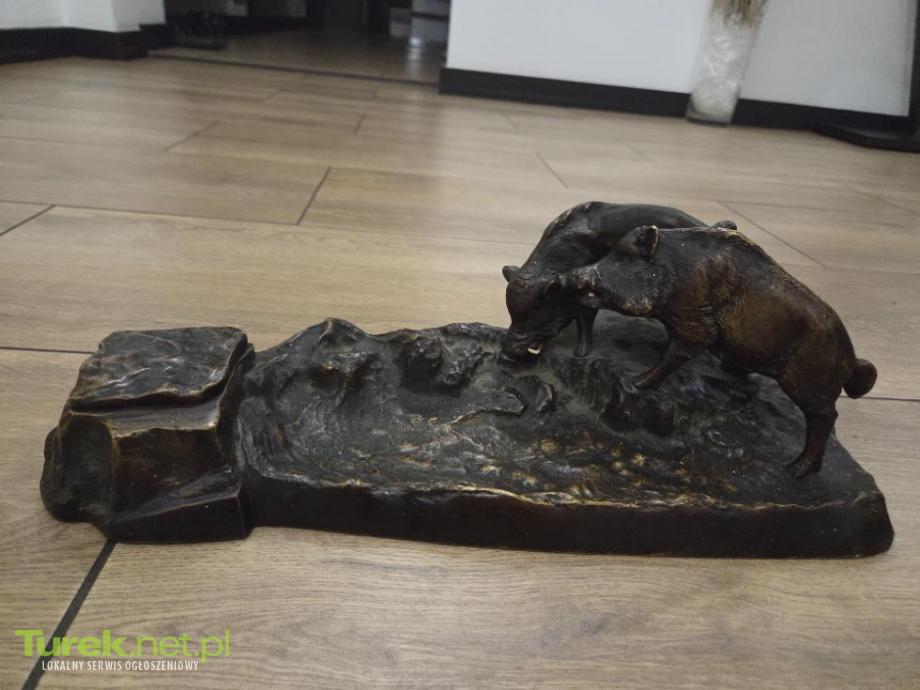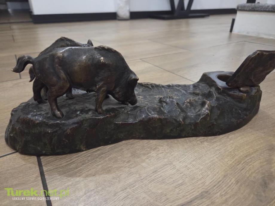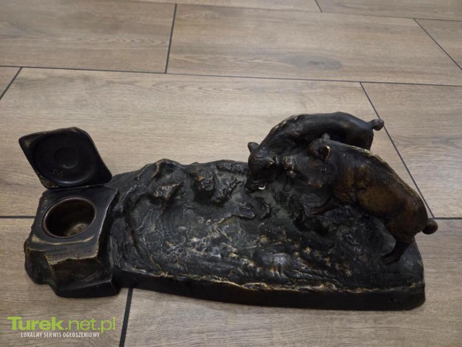 Sprzedam duży kałamarz z brązu [długość 43 cm ,szerokość 19 , wielkość dzika ok 9 cm] Przedstawiony na zdjeciach kałamarz zdobi para dzików. Pojemnik na atrament ukryty został w pniu drzewa, do którego zbliżają się zwierzęta poszukujące pożywienia. Kałamarz ten spełniał funkcję praktyczną, ale jednocześnie nie można mu odmówić cech artystycznych