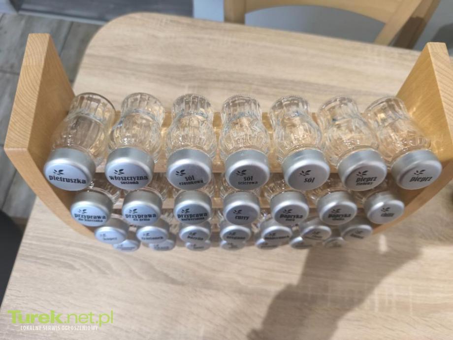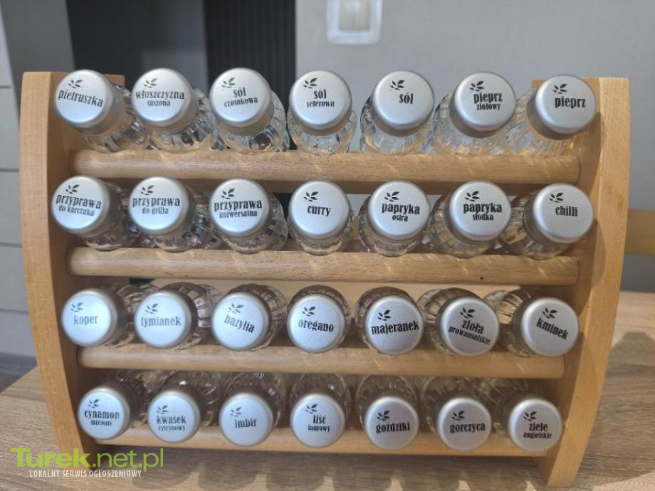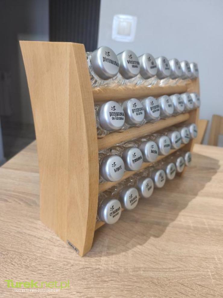 Praktyczny drewniany stojak na przyprawy, w którym znajduje się 28 szklanych pojemników na różne przyprawy. Stojak zapewnia wygodne przechowywanie i łatwy dostęp do potrzebnych przypraw w kuchni.Wycokość 27 szerokość 36cm. Używany w bardzo dobrym stanie.