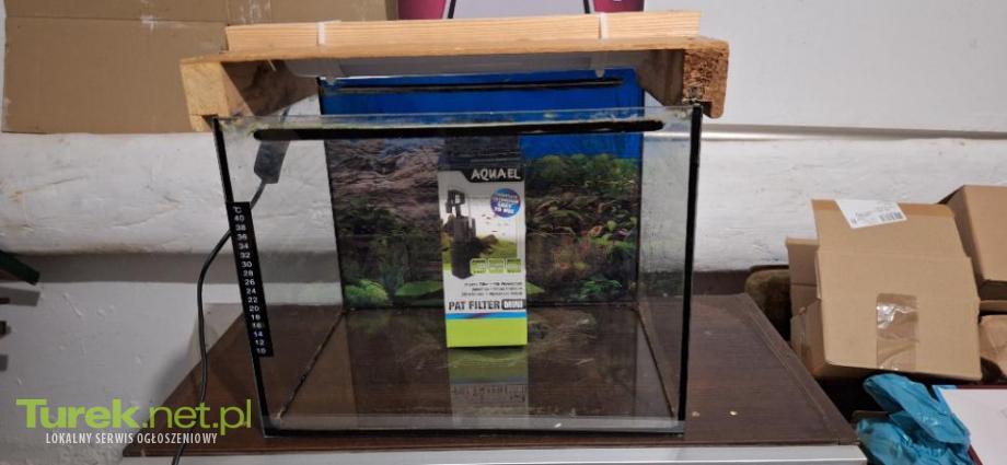 Sprzedam akwarium 24 L sużyło mi jako kotnik akwarium ze zrobioną pokrywą oświetleniem filtrem pat mini aquel tło termometr mogę dorzucić żwirek akwarium szczelne nie klejone wymiary 35x25x27 odbiór osobisty turek cena 110 zł