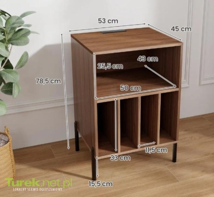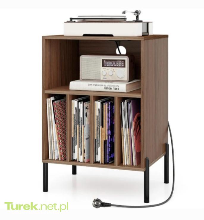 Pasuje do każdego wnętrza – od mieszkania po przyczepę kempingową – nie zajmując cennego miejsca, a jego nowoczesny design podkreśli każdy wystrój. Cechy produktu: Elegancki design: Drewniana rama i metalowe nogi łączą w sobie rustykalny i nowoczesny styl. Dużo miejsca do przechowywania: Zawiera otwartą półkę i 4 duże przegrody na płyty, książki i przedmioty dekoracyjne. Solidna konstrukcja: Wykonana z trwałego drewna, które się nie odkształca, z czterema metalowymi podporami zapewniającymi dodatkową stabilność. Wbudowana stacja ładowania: Wyposażona w 2 gniazda zasilania, 2 USB i 1 typu C, co umożliwia łatwe ładowanie urządzeń.