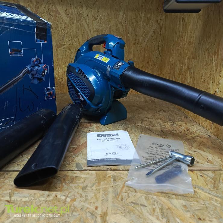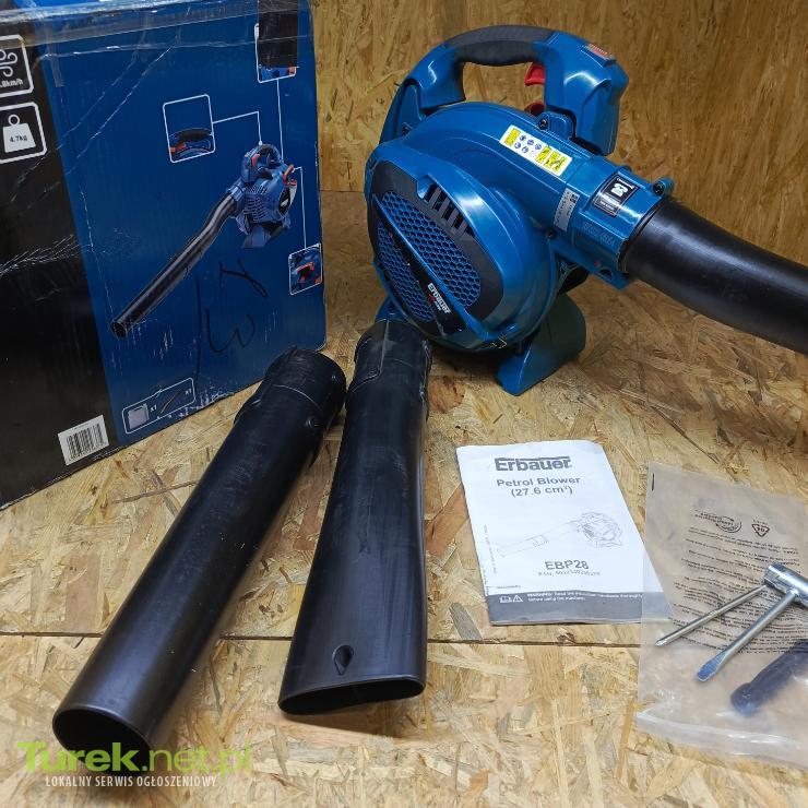 Przedmiotem sprzedaży jest dmuchawa spalinowa erbauer. Zdjęcia przedstawiają rzeczywisty stan przedmiotu. Erbauer 27,6 cm3 EBP28 Urządzenie używane, sprawne. Cykl pracy: 2-suwowy Maksymalne obroty na minutę: 8300rpm Wymiary produktu wys. 350 x szer. 250 x dł. 975 mm Obszary zastosowania prace porządkowe wokół domu i w ogrodzie Maksymalna prędkość wydmuchu 320 km/h Maksymalny wydatek powietrza 678 m3/h Moc znamionowa 1,1 hp