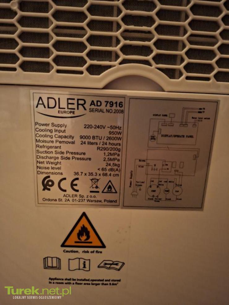 Sprzedam klimatyzator adler7916 w pełni sprawny mało używany cena nowego to około 1700zł, Energooszczędny i wielozadaniowy Duża wydajność klimatyzatora sprawia, że poradzi on sobie ze schłodzeniem każdego pomieszczenia do 25 m². Oscylacja pionowa 60 pozwala ustawić go w dowolnym miejscu bez obaw, że zajmie dużo przestrzeni. Kółeczka oraz wygodny uchwyt transportowy pozwalają na szybkie przeniesienie urządzenia z jednego pokoju do drugiego. Wydajność chłodzenia: 9000 BTU / godz. wydajność chłodzenia: 2600W pobór energii chłodzenie: 950W skuteczna powierzchnia chłodzenia do 25 m² 3 tryby pracy: chłodzenie, osuszanie oraz nawiew zakres regulacji temperatury 15-31°C 2 ustawienia prędkości wentylatora przepływ powietrza: 380m³ / godzinę wydajność osuszania: 24 litry / dzień klasa energetyczna A czasomierz: 1-24 godziny LED wyświetlacz oscylacja pionowa 60° czynnik chłodzący R290 pilot zdalnego sterowania z baterią: CR2025 maks. długość dołączonej rury wylotowej: 150cm średnica zewn. / wewn. dołączonej rury wylotowej: 15,0 / 13,4 cm kółeczka ułatwiające ustawianie poziom głośności:
