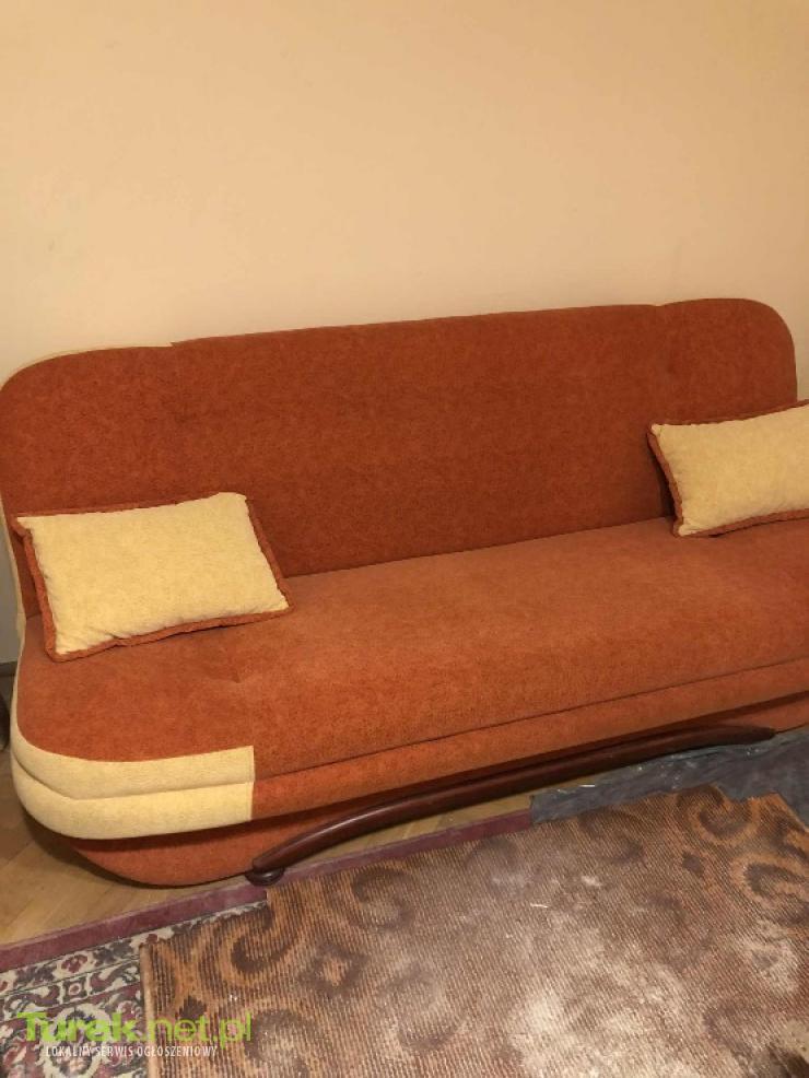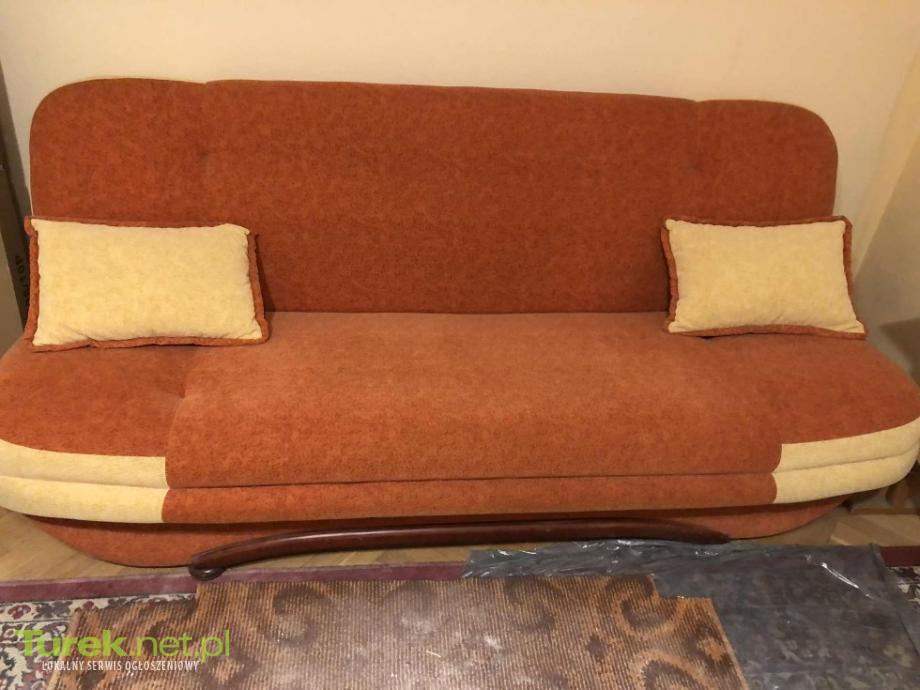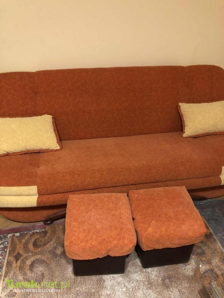 Na sprzedaż kanapa wersalka rozkładana z pojemnikiem na pościel. Stan jak nowy. Gratis dwie pufy i dwie poduszki widoczne na zdjęciach. Odbiór Turek, możliwy transport.