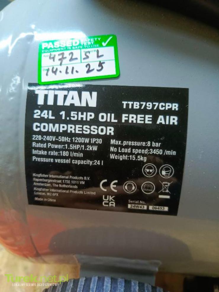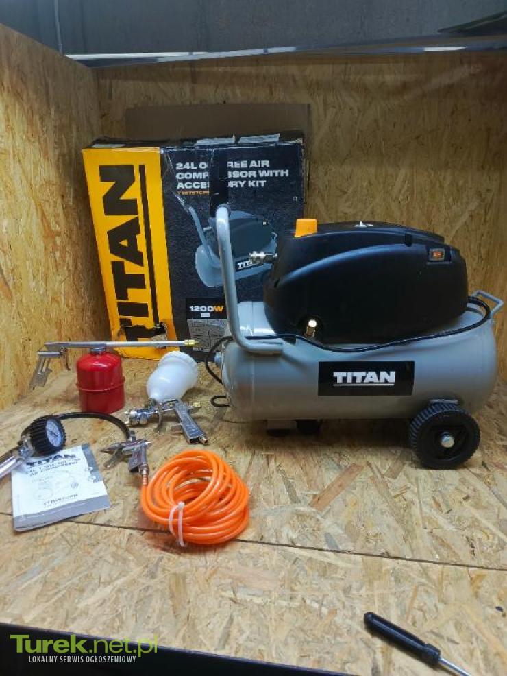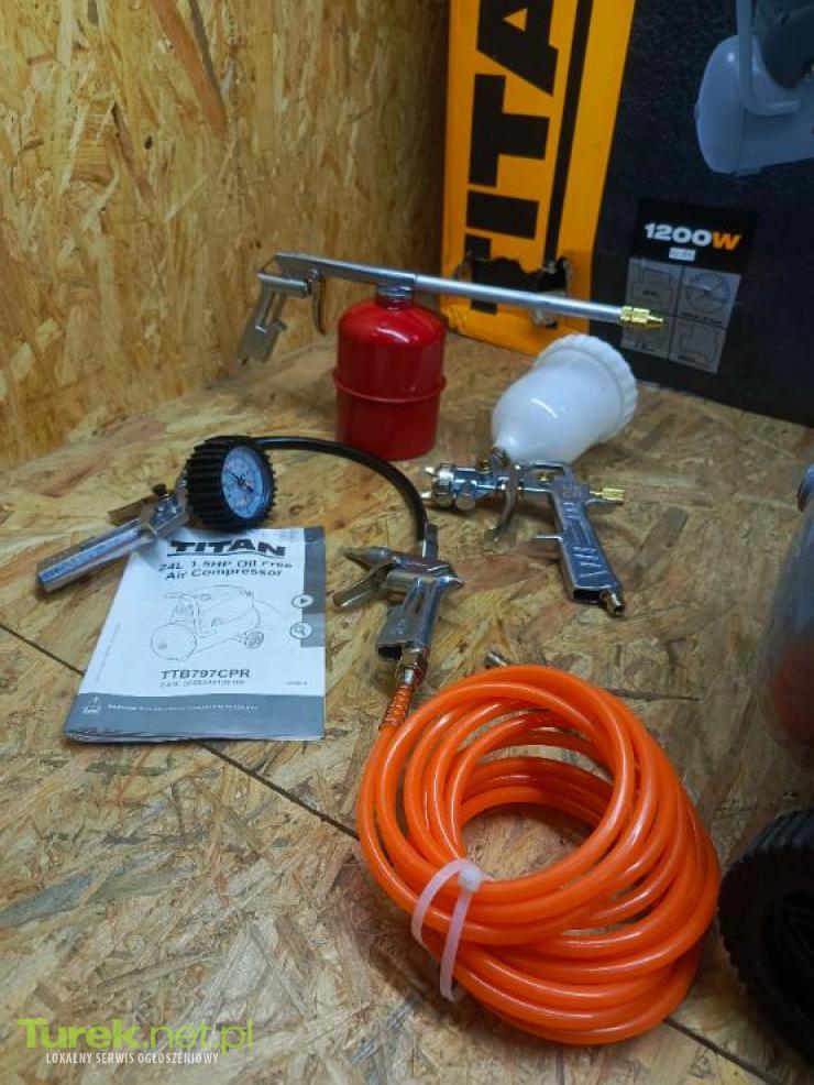 Przedmiotem sprzedaży jest kompresor bezolejowy titan 24 l. Sprzęt w bdb stanie. Komplet akcesoriów widoczny na zdjęciach. CECHY PRODUKTU: moc znamionowa 1,2 kW – 1,6 KM zasilanie 230V/50Hz prędkość 3450 obrotów/min pojemność zbiornika 24 l max przepływ powietrza 180 l/min max sprężanie 8 bar waga 15,5 kg