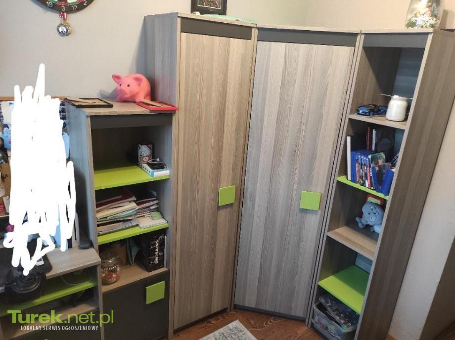 Sprzedam meble dziecięce z szafą narożną, biurkiem i półka wisząca.