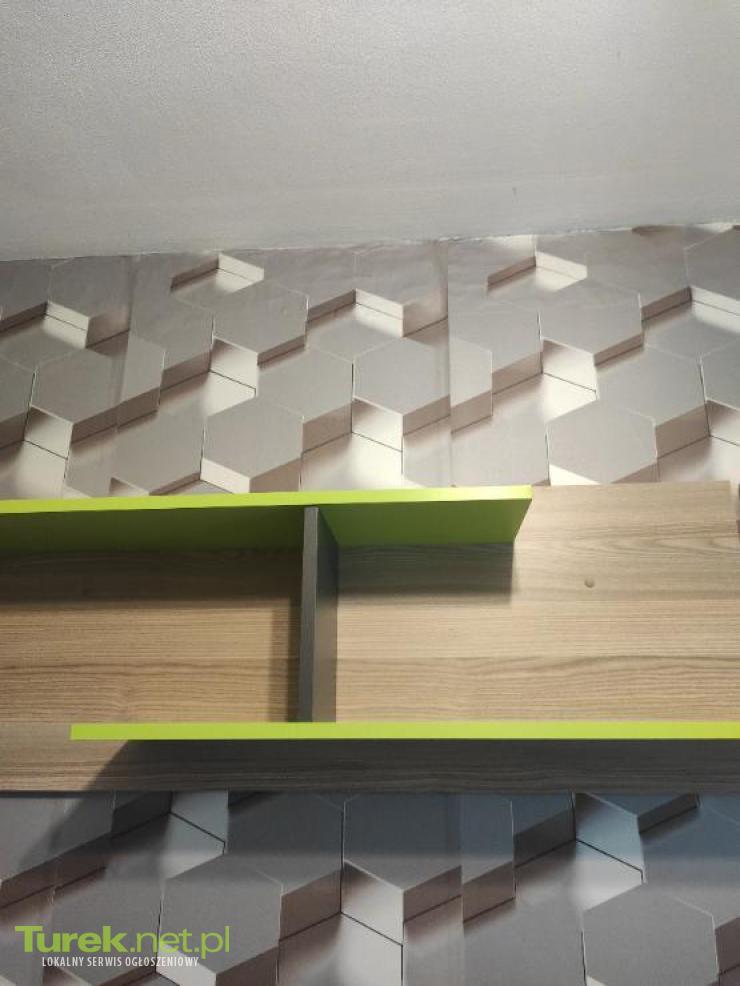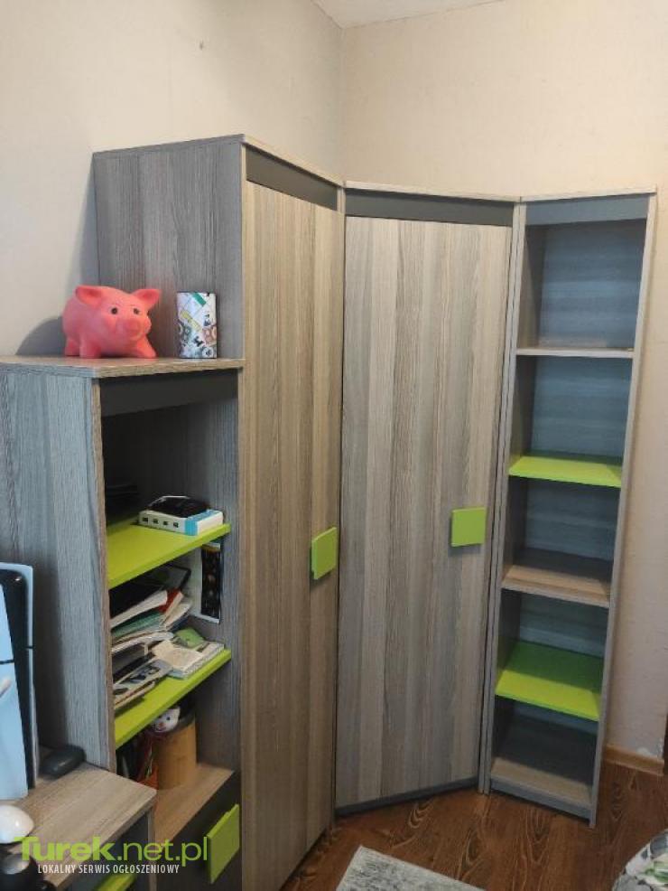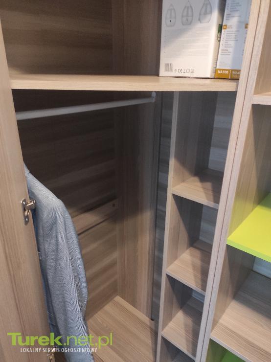 Sprzedam meble dziecięce z szafą narożną o wysokości 187,z dwoma slupkami na książki i słupkiem na ubrania z 5 półkami w środku , biurkiem o szerokości 110 i półka wisząca także 110cm.