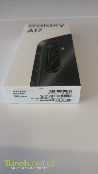 Samsung Galaxy A17 4/128 GB – nowy, zafoliowany. Na sprzedaż nowy, fabrycznie zapakowany smartfon Samsung Galaxy A17 w kolorze czarnym. Telefon nieużywany, w oryginalnym opakowaniu, kompletny zestaw od producenta. Specyfikacja: ekran 6,7”, 4 GB RAM / 128 GB pamięci, aparaty: tylny 50 Mpx + 5 Mpx + 2 Mpx, przedni 13 Mpx, bateria 5000 mAh, Dual SIM, NFC, system Android. Cena: 650 zł (cena w sklepie 735 zł). Odbiór osobisty: Turek