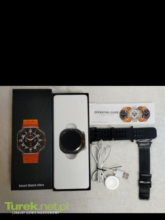 Smartwatch, model Smart Watch Ultra. Zegarek posiada funkcje monitorowania zdrowia, takie jak tętno, poziom tlenu we krwi, sen i aktywność fizyczna. Umożliwia prowadzenie rozmów telefonicznych dzięki wbudowanemu głośnikowi i mikrofonowi. Oferuje asystenta głosowego, stoper, kalendarz, budzik, kalkulator i powiadomienia. Można ustawić dowolne zdjęcie z telefonu jako tapetę ekranu. W zestawie znajduje się ładowarka indukcyjna oraz dodatkowy pasek. Cena 200 zł do negocjacji odp na SMS