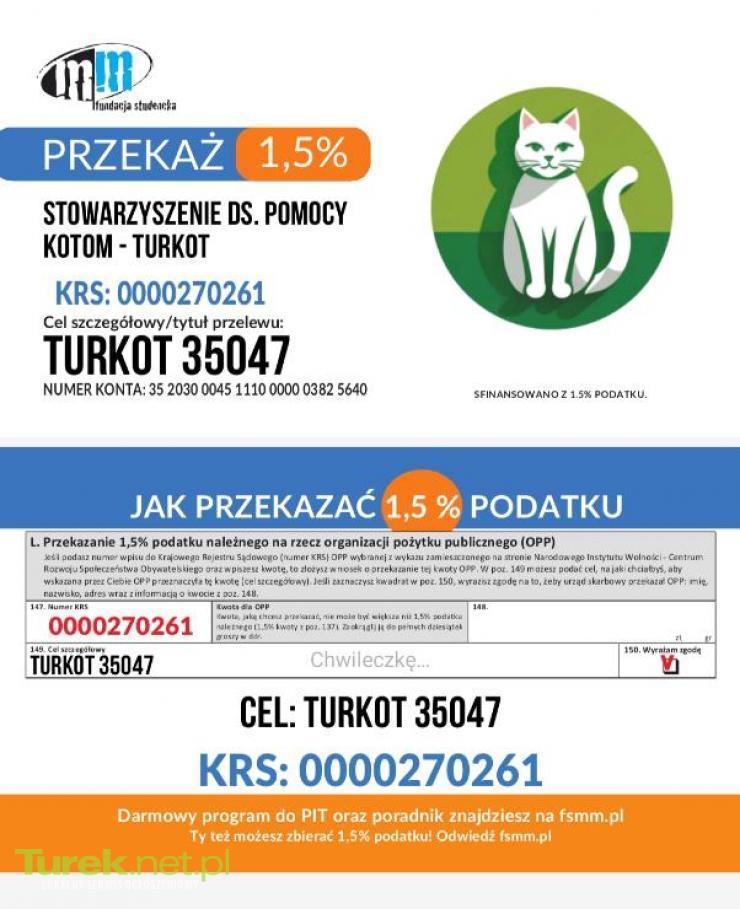 Kochasz zwierzęta ? Wesprzyj lokalną organizacje, która zajmuje się ratowaniem kotów z powiatu tureckiego. TURKOT powstał z potrzeby serca, z miłości do kotów i pasji do pomagania. Twój procent z podatku będzie ratować życie. Informacje na plakacie. Zapraszamy na naszą stronę na Facebooku : Stowarzyszenie ds. Pomocy Kotom - TURKOT. Życzliwość otwiera kotom drogę do dobrego życia.