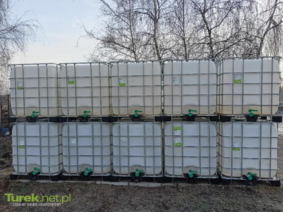 Beczki, paletopojemniki 1000 L na paliwa, deszczówkę. Pojemniki w bardzo dobrym stanie na metalowych, plastikowych paletach bez osadu w środku. Są to zbiorniki głównie po chlorze lub wodzie utlenionej. Idealne do RSM, oleju opałowego, nieczystości, nawozów itp. Posiadają szczelne, kompletne zawory oraz pokrywy górne. Turek