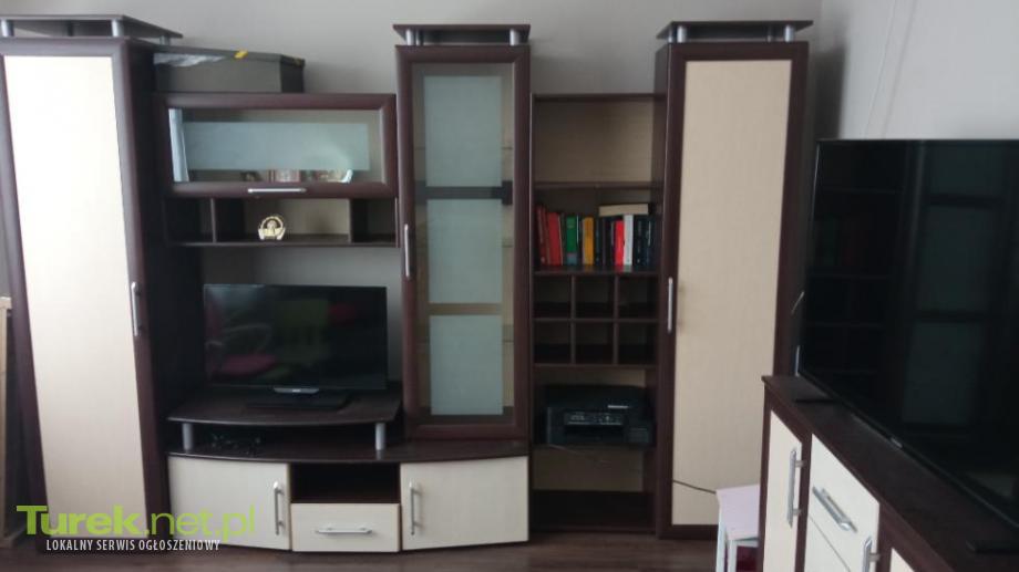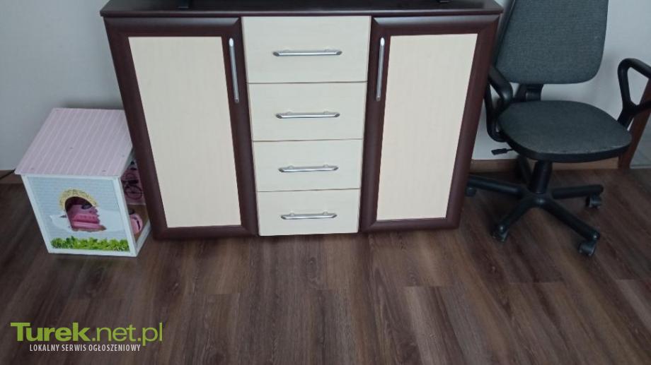 Zestaw mebli w kolorze ciemnego drewna, w skład którego wchodzi komoda oraz regał z półkami i szafkami. Meble są w dobrym stanie, gotowe do użytkowania.
