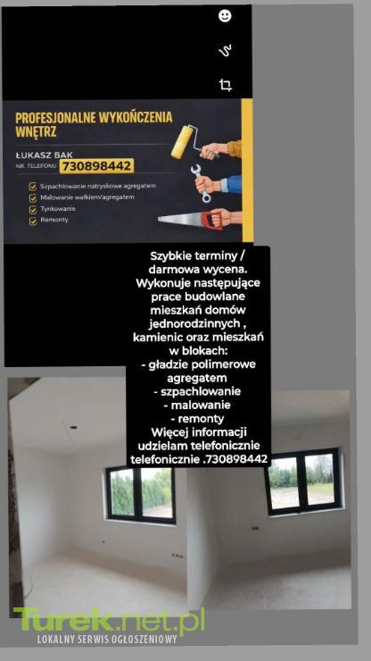 GŁADZIE/ MALOWANIE Szybkie terminy -najtańsze ceny w regionie / Gdy budowa ogrzewana termin do realizacji usługi w ciągu paru dni - zimą pierwszeństwo mają Ci co posiadają już ogrzewanie sprzyjające pracą wykończeniowym !! ) Wykonuje następujące prace budowlane mieszkań domów jednorodzinnych , kamienic oraz mieszkań w blokach: - gładzie NATRYSKOWE - szpachlowanie - malowanie - remonty Więcej informacji udzielam telefonicznie ----730898442 ---- kontakt do mnie . lokalizacja Konin +-100 km ( cena tania - zależna od zakresu wykonywanych prac )