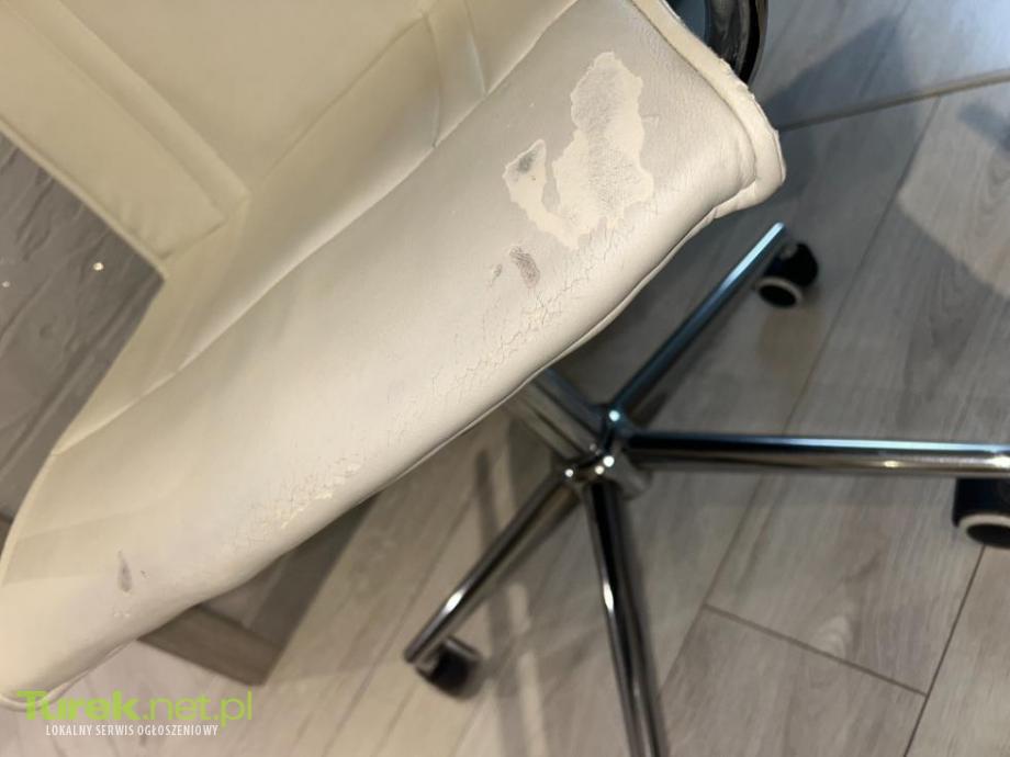 Sprzedam krzesło biurowe obrotowe w kolorze białym (eko skóra). Krzesło było używane, posiada widoczne przetarcia i lekkie pęknięcia na siedzisku (widoczne na zdjęciach), które są wyłącznie wizualne.