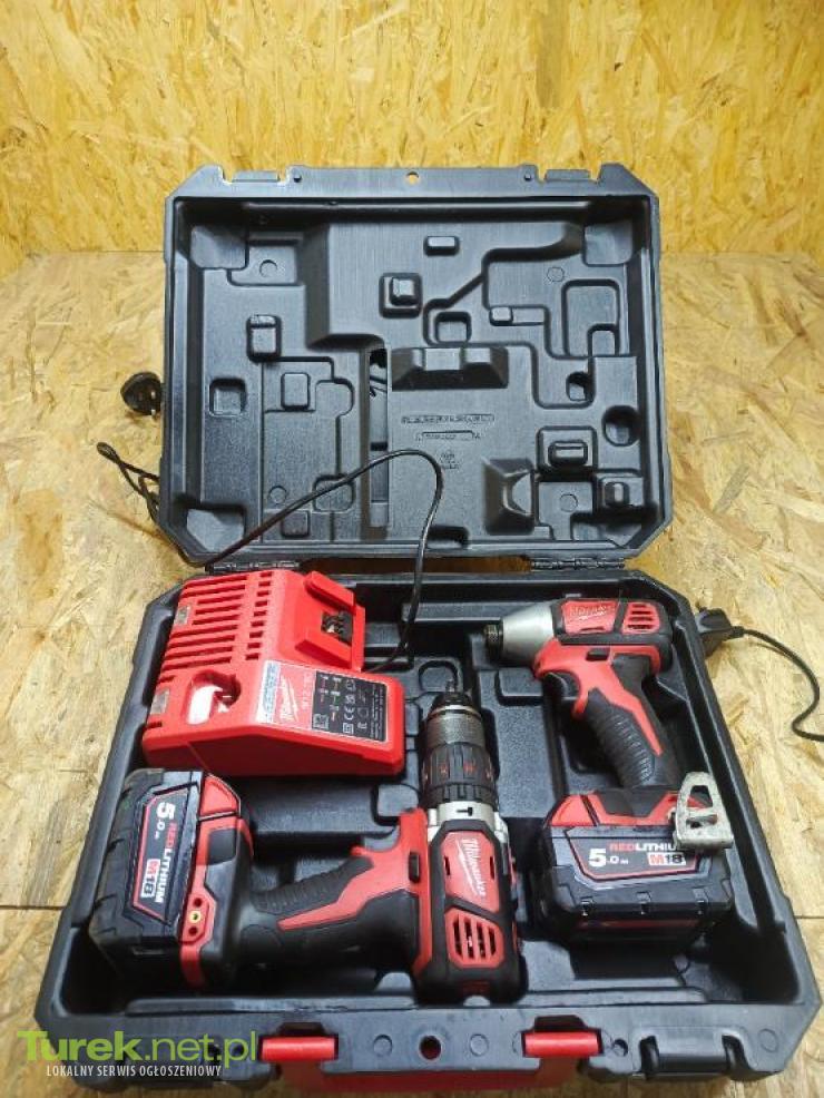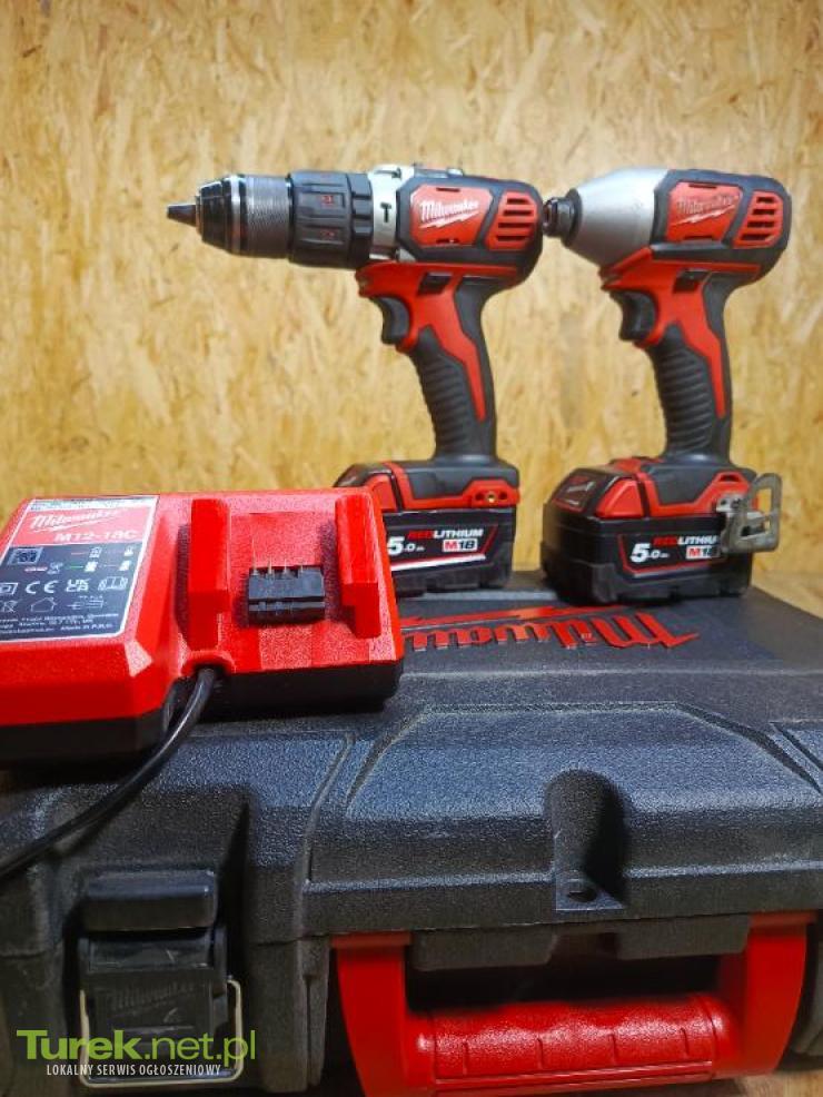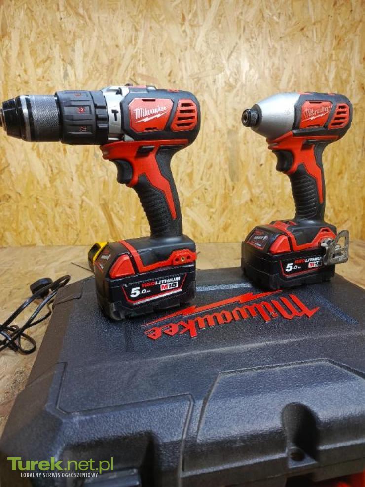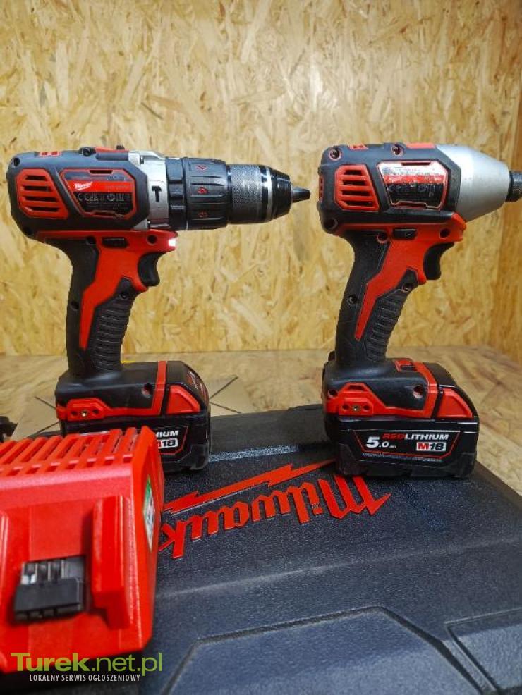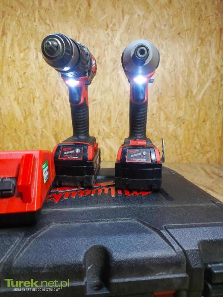 Zestaw narzędzi Milwaukee M18 - wiertarka i wkrętarka. Zasilane akumulatorami litowo-jonowymi o pojemności 4,0 Ah. Solidne, profesjonalne narzędzia do prac remontowo-budowlanych.